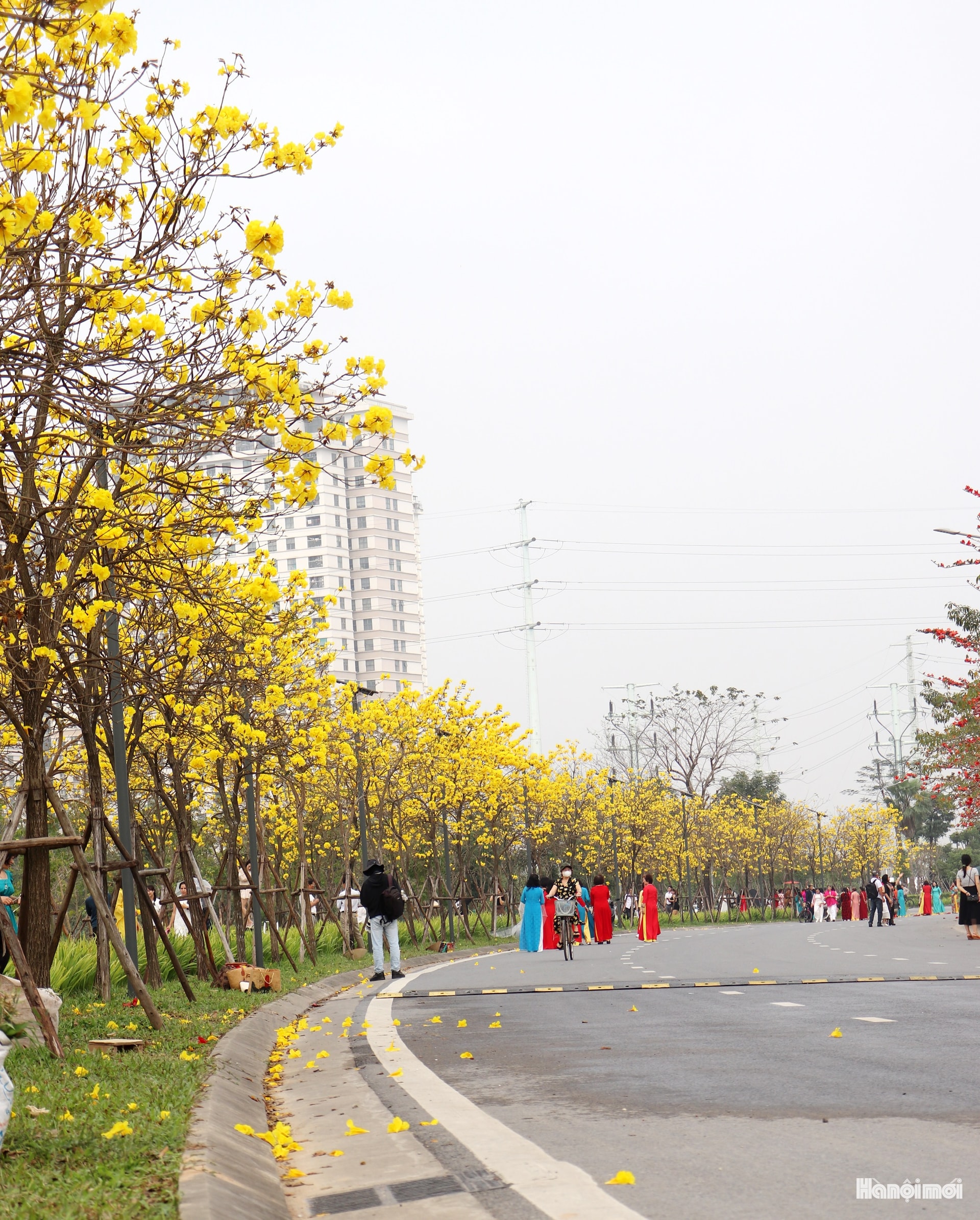 Sắc vàng hoa phong linh cùng hoa mộc miên nở rộ trên những tuyến đường nội khu Park City Hanoi. Ảnh: Tuấn Điệp