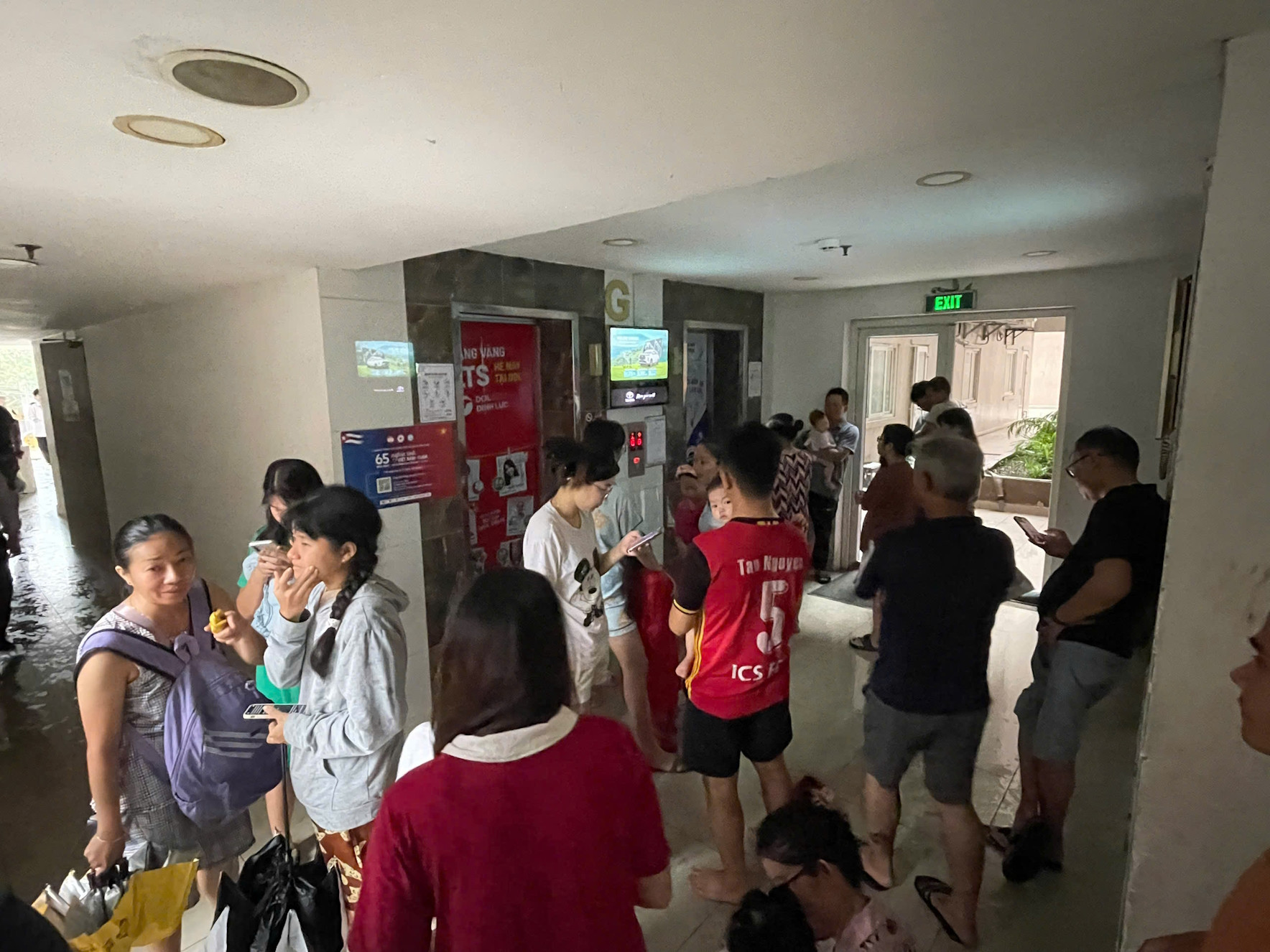 Cư dân tháo chạy ra ngoài, tập trung dưới sảnh của chung cư. Ảnh: HA.