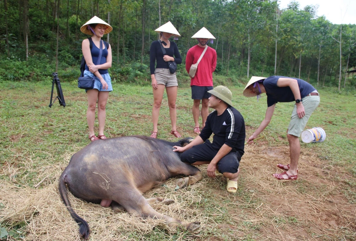 Bên cạnh dịch vụ massage vịt, du khách còn được trải nghiệm cưỡi trâu và xem quy trình huấn luyện trâu thực hiện các hiệu lệnh đứng lên, nằm xuống. Chị Julia (du khách Anh) bày tỏ sự ngạc nhiên khi lần đầu được ôm một chú trâu: "Nó rất thư thái và thân thiện, tôi có thể thoải mái cho nó ăn cỏ và lá chuối." Ngoài ra, hoạt động câu cá tại ao cũng mang lại không gian thư giãn tĩnh lặng cho khách tham quan.