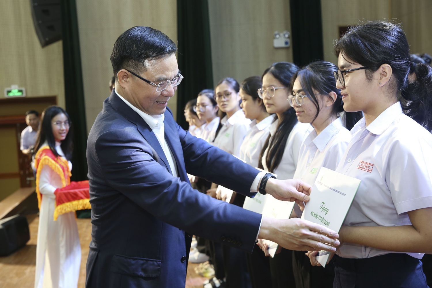 Đồng chí Lê Mạnh Hùng – Bí thư Đảng ủy, Chủ tịch HĐTV Petrovietnam trao tặng các phần quà cho các học sinh có thành tích cao trong học tập tại Trường THPT chuyên Lê Khiết.