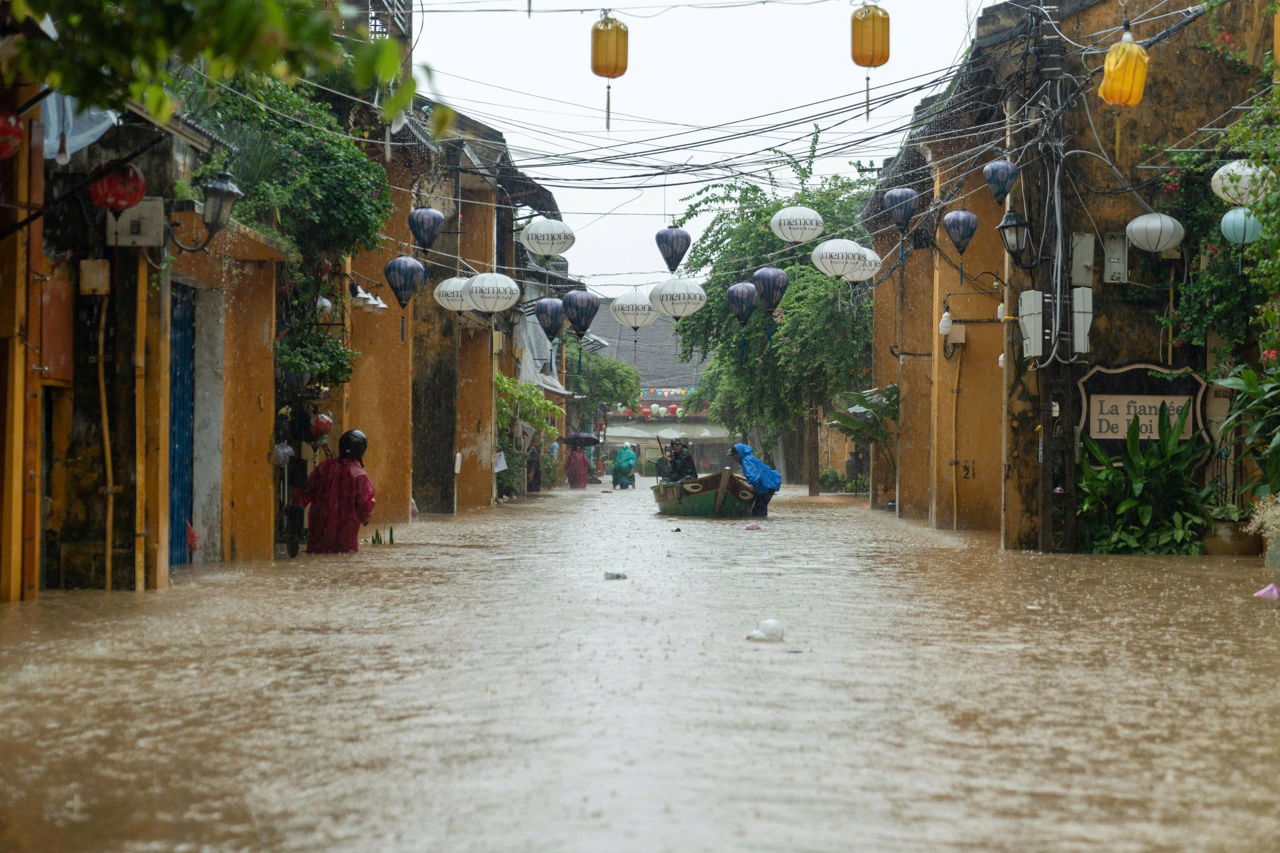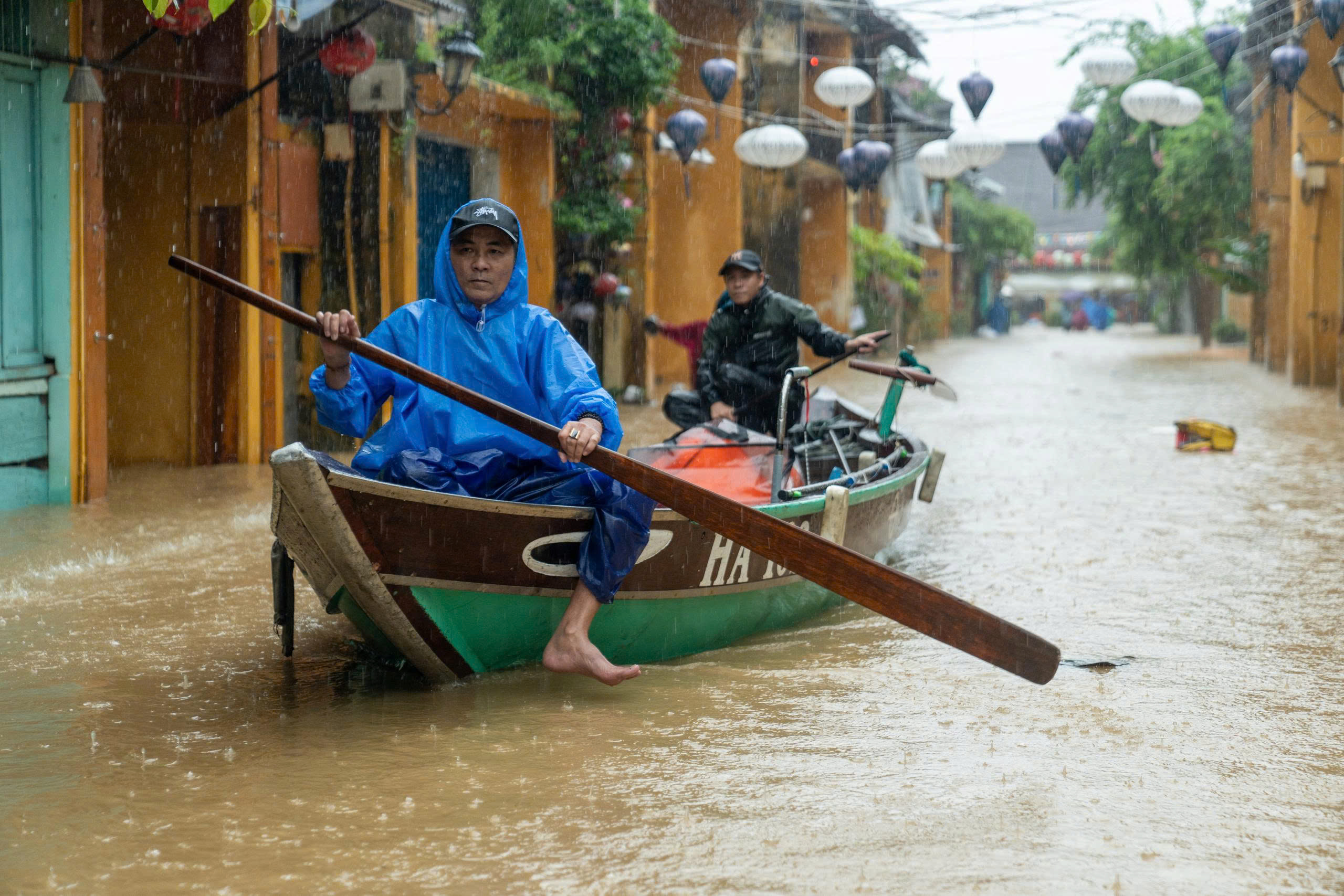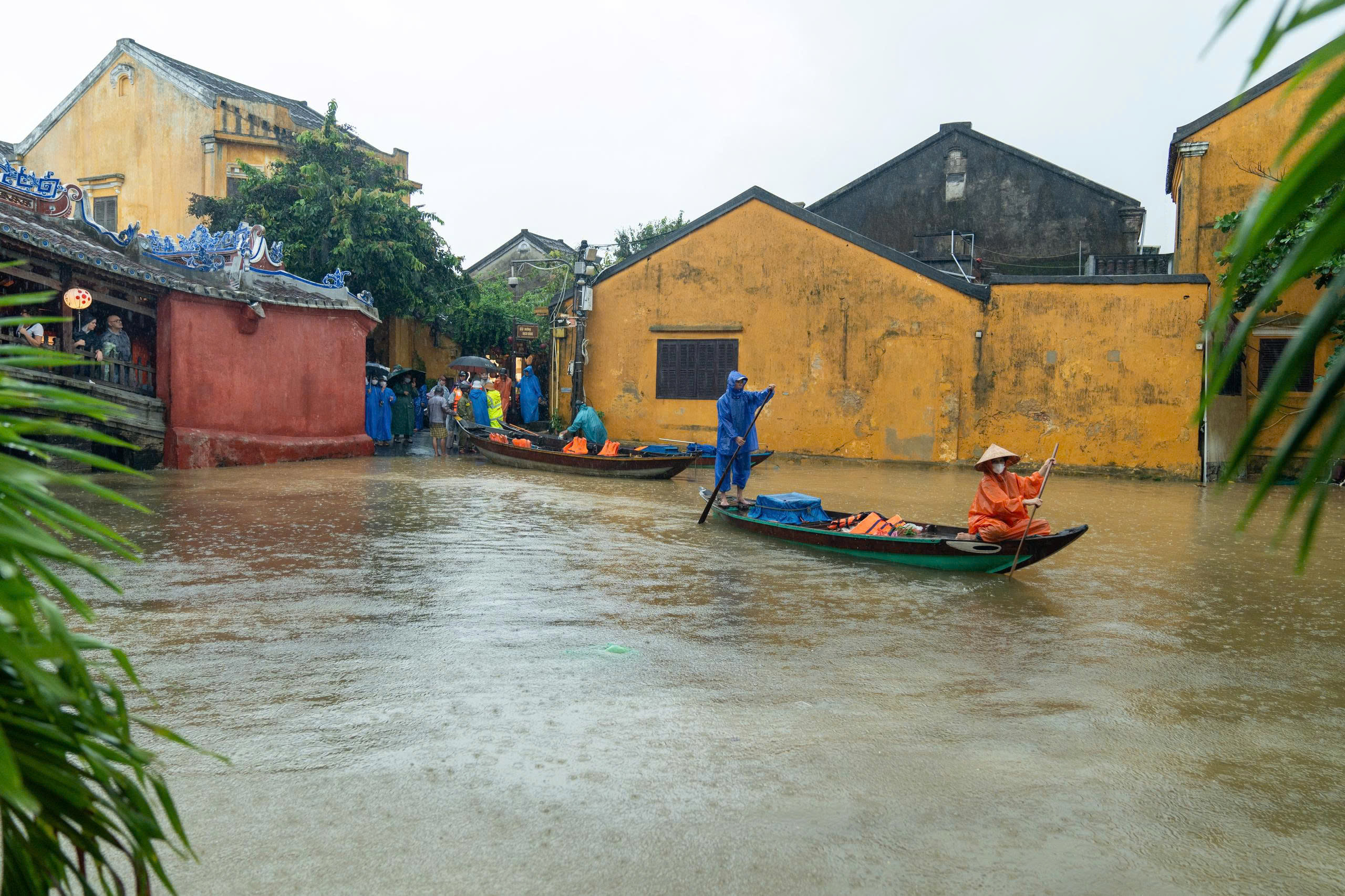 Nhiều tuyến đường ngập nặng, người dân đi lại bằng thuyền trong phố cổ. Ảnh: VÕ VĂN PHI LONG