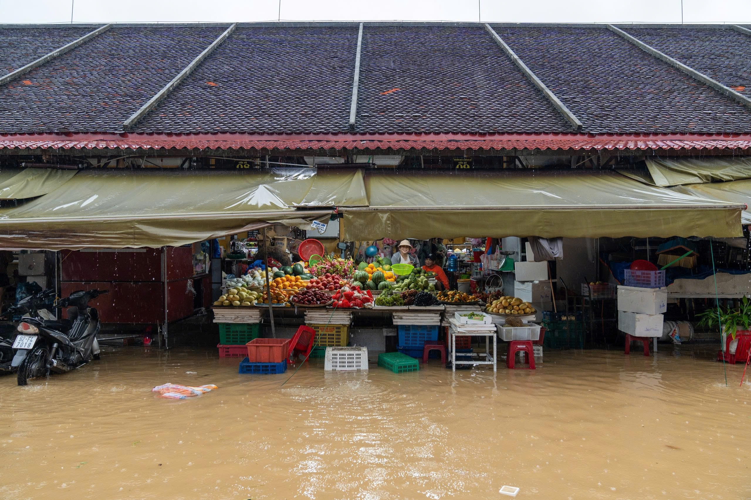 Một quầy bán trái cây tại chợ Hội An bị nước lũ ghé thăm. Ảnh: VÕ VĂN PHI LONG