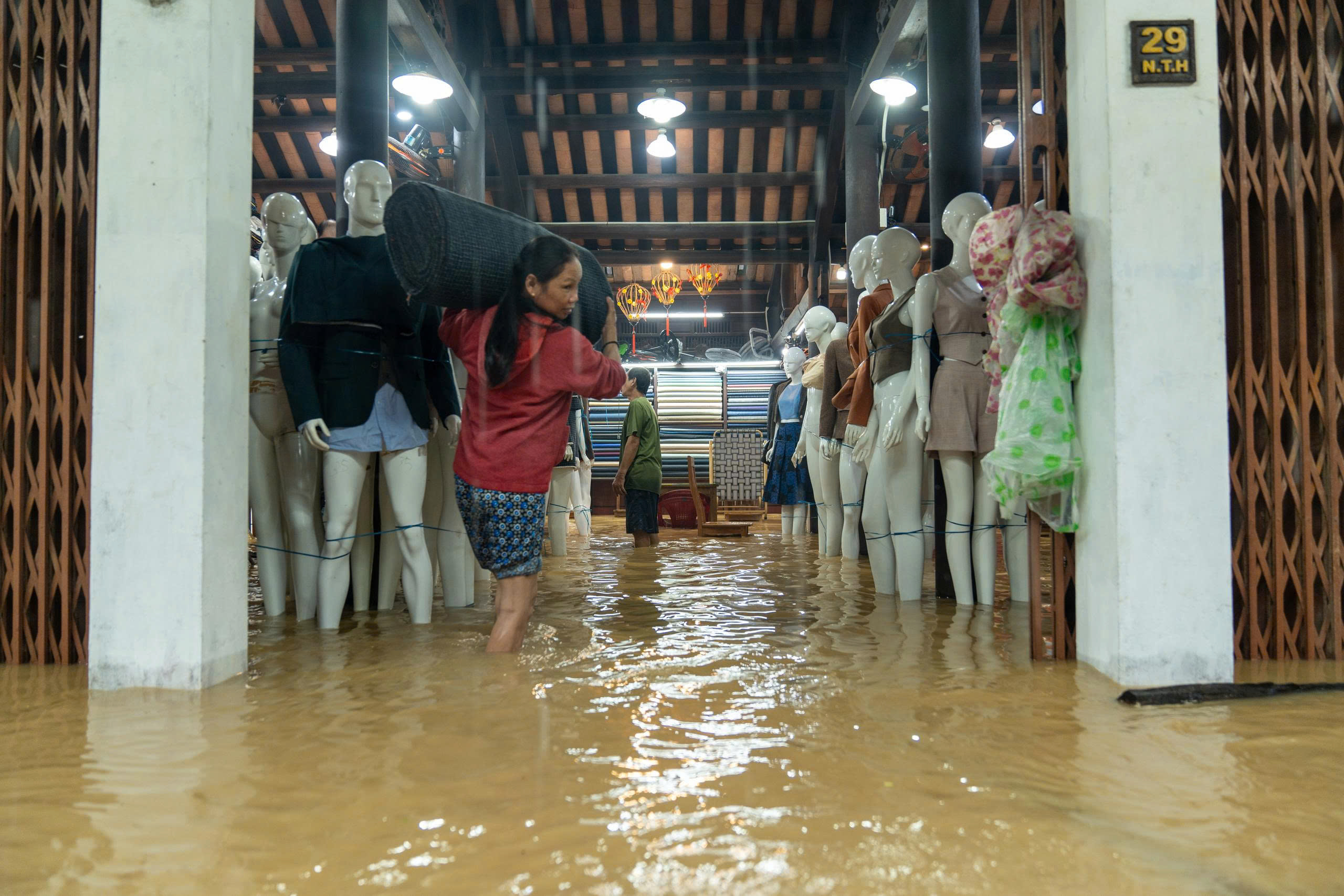 Trong sáng 27-10, nhiều người kinh doanh, buôn bán ở chợ Hội An và các cửa hàng trong khu phố cổ đã rất vất vả khuân dọn đồ đạc, đưa hàng hóa lên cao để tránh bị hư hại.