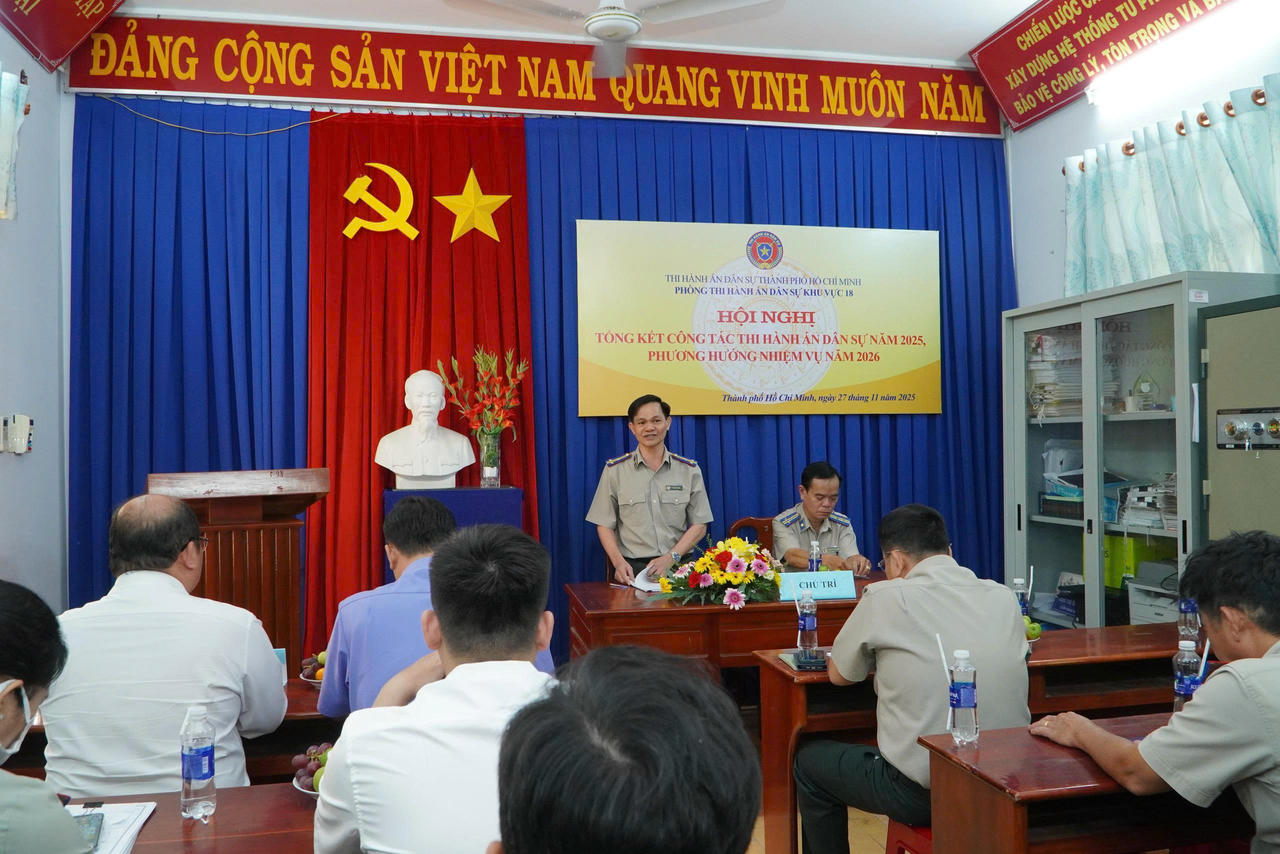 Phát biểu chỉ đạo tại Hội nghị, đồng chí Võ Đức Tùng, Phó Bí thư Đảng ủy, Phó Trưởng Thi hành án dân sự TP ghi nhận và đánh giá cao nỗ lực của tập thể Phòng Thi hành án dân sự Khu vực 18 trong năm đầu tiên triển khai mô hình tổ chức mới. Trong điều kiện khối lượng án tăng cao, địa bàn rộng, lại vừa thực hiện việc sáp nhập, tiếp nhận số lượng lớn hồ sơ từ các đơn vị khác chuyển giao, nhưng đơn vị vẫn hoàn thành và vượt các chỉ tiêu về việc, về tiền do ngành giao, giữ vững kỷ luật, kỷ cương, không để phát sinh sai phạm lớn trong hoạt động thi hành án.