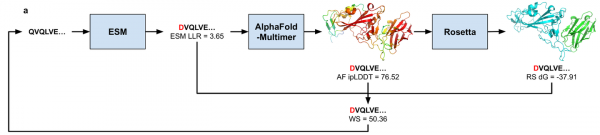Mỗi vòng thiết kế nanobody đều bắt đầu bằng một chuỗi nanobody. ESM tính toán tỷ lệ log-likelihood (ESM LLR) của từng đột biến điểm đơn lẻ so với chuỗi đầu vào