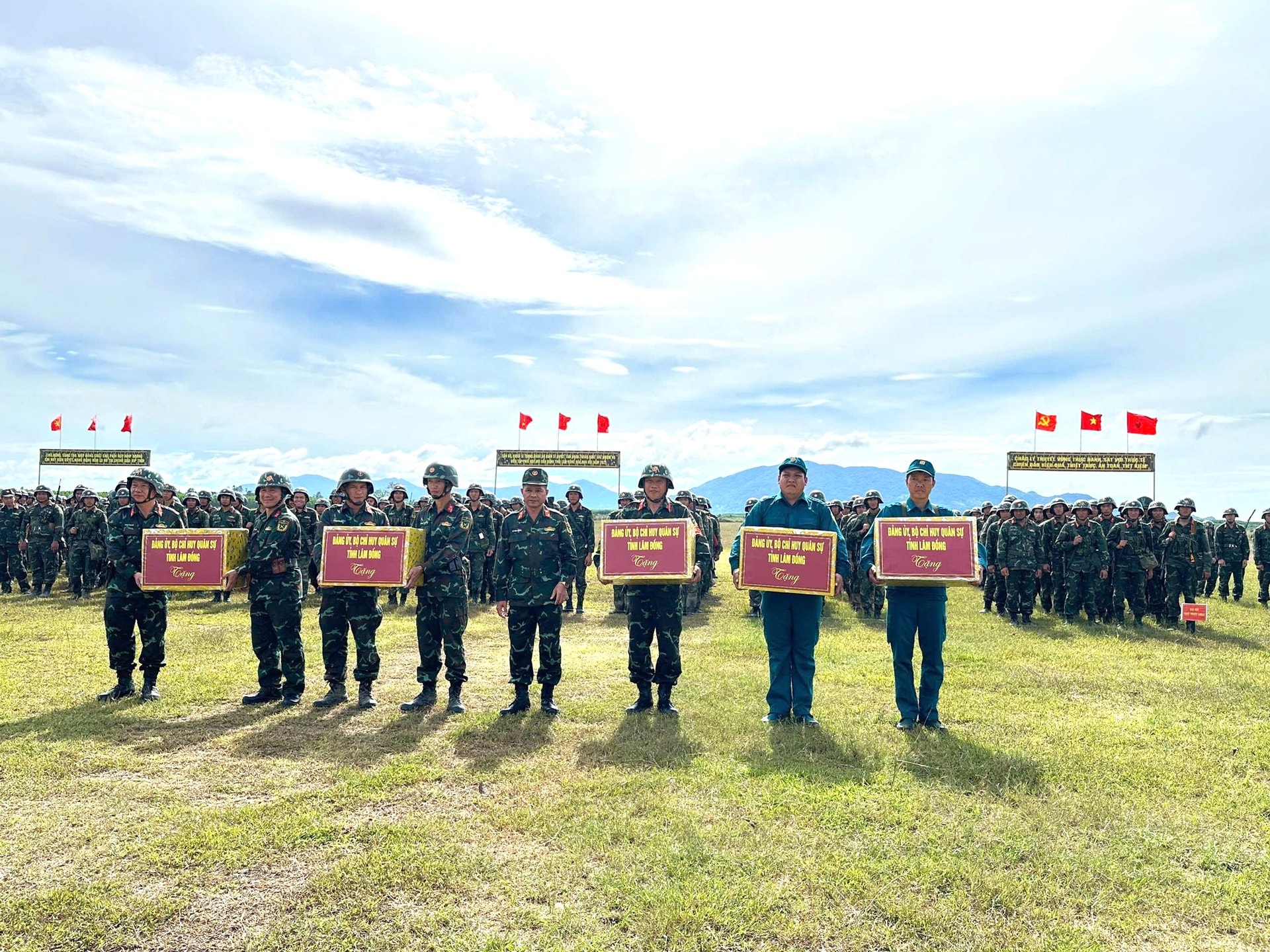 Đại tá Lê Anh Vương, Phó Chỉ huy trưởng, Tham mưu trưởng Bộ CHQS tỉnh Lâm Đồng tặng quà lực lượng tham gia diễn tập