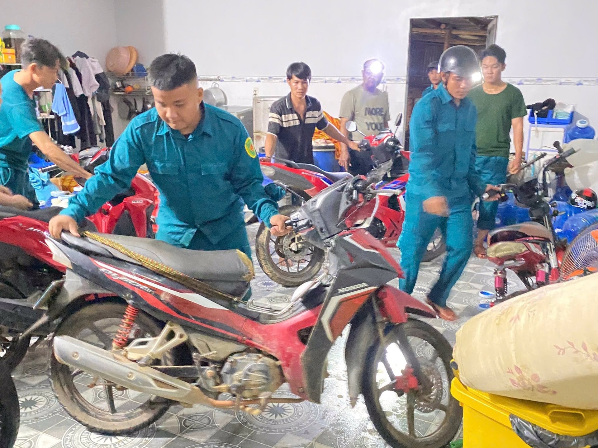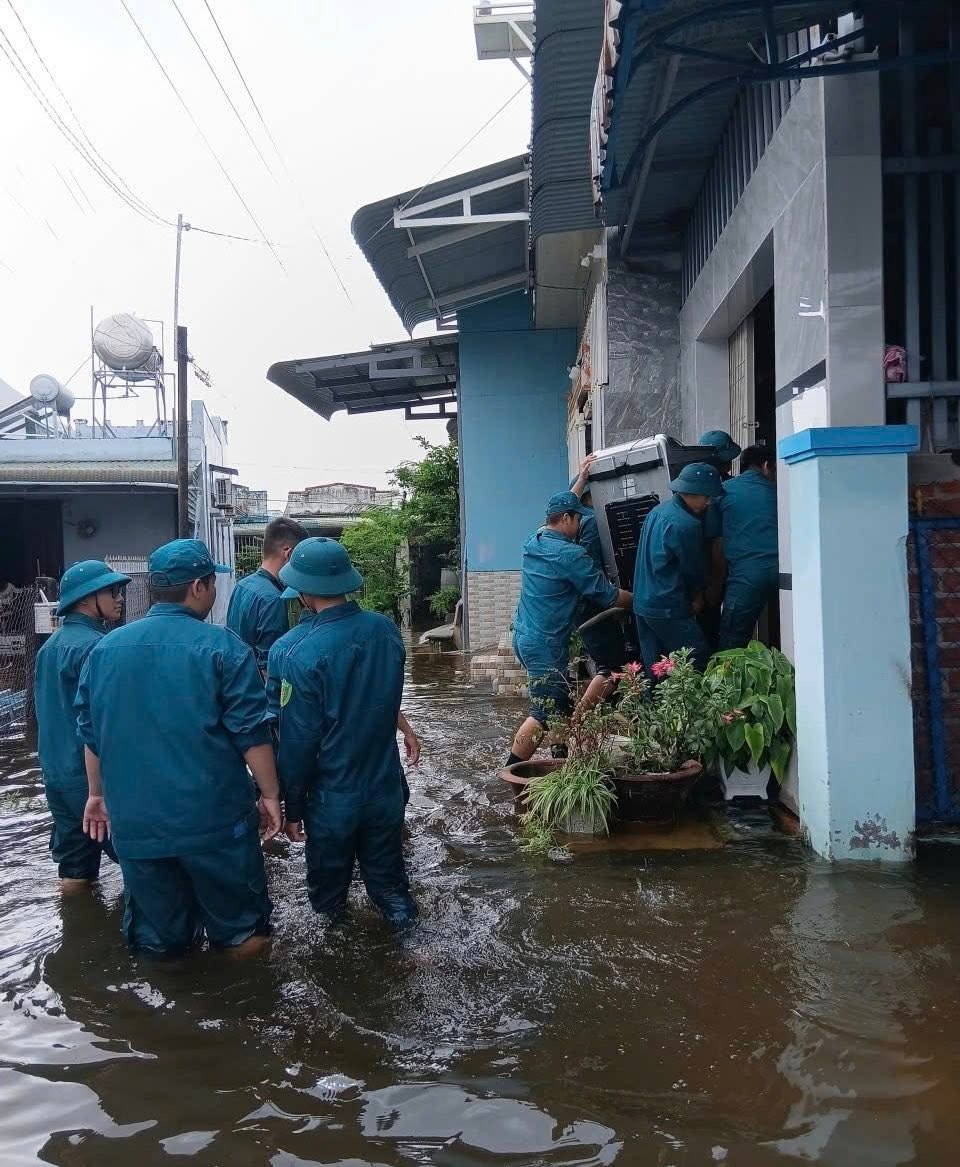 Cán bộ, chiến sĩ Ban CHQS các xã trên địa bàn PTKV4 - La Gi giúp dân di chuyển tài sản đến nơi khô ráo, an toàn khi mưa lũ