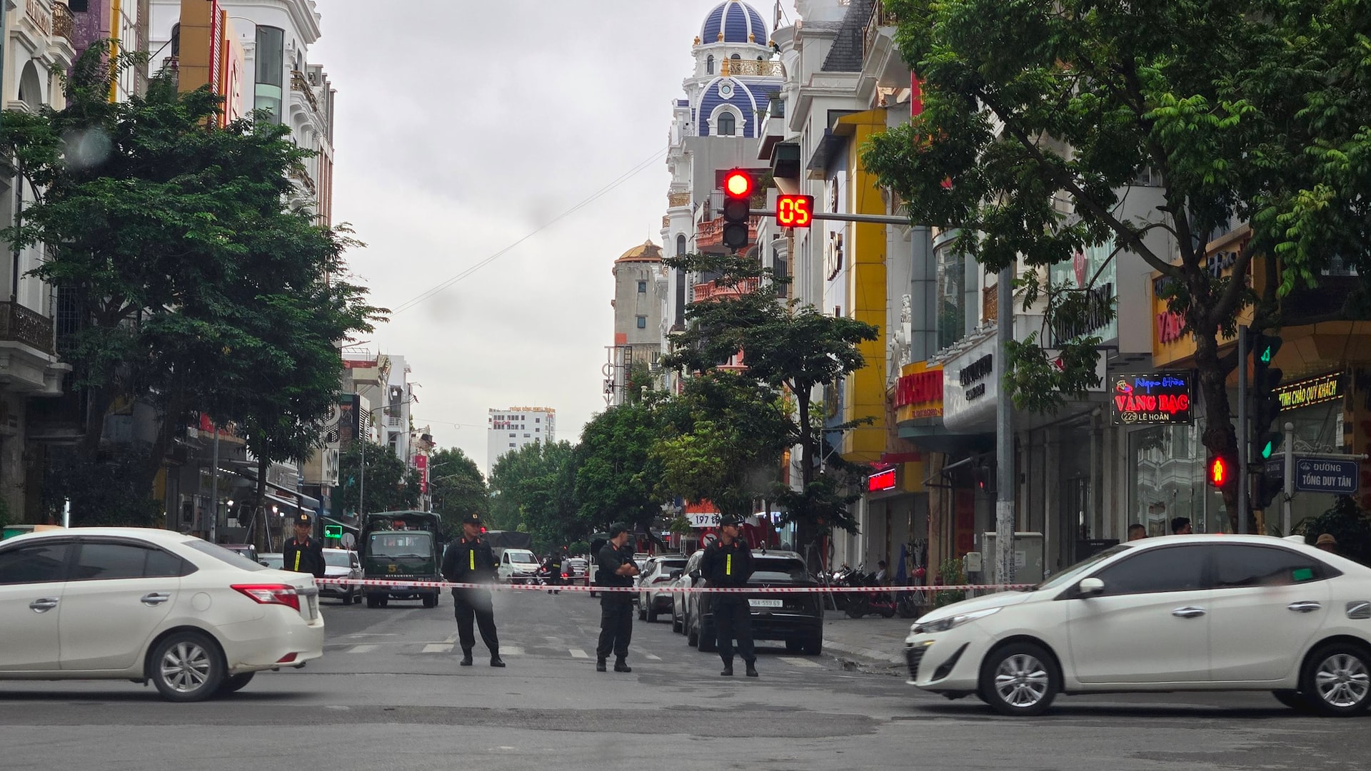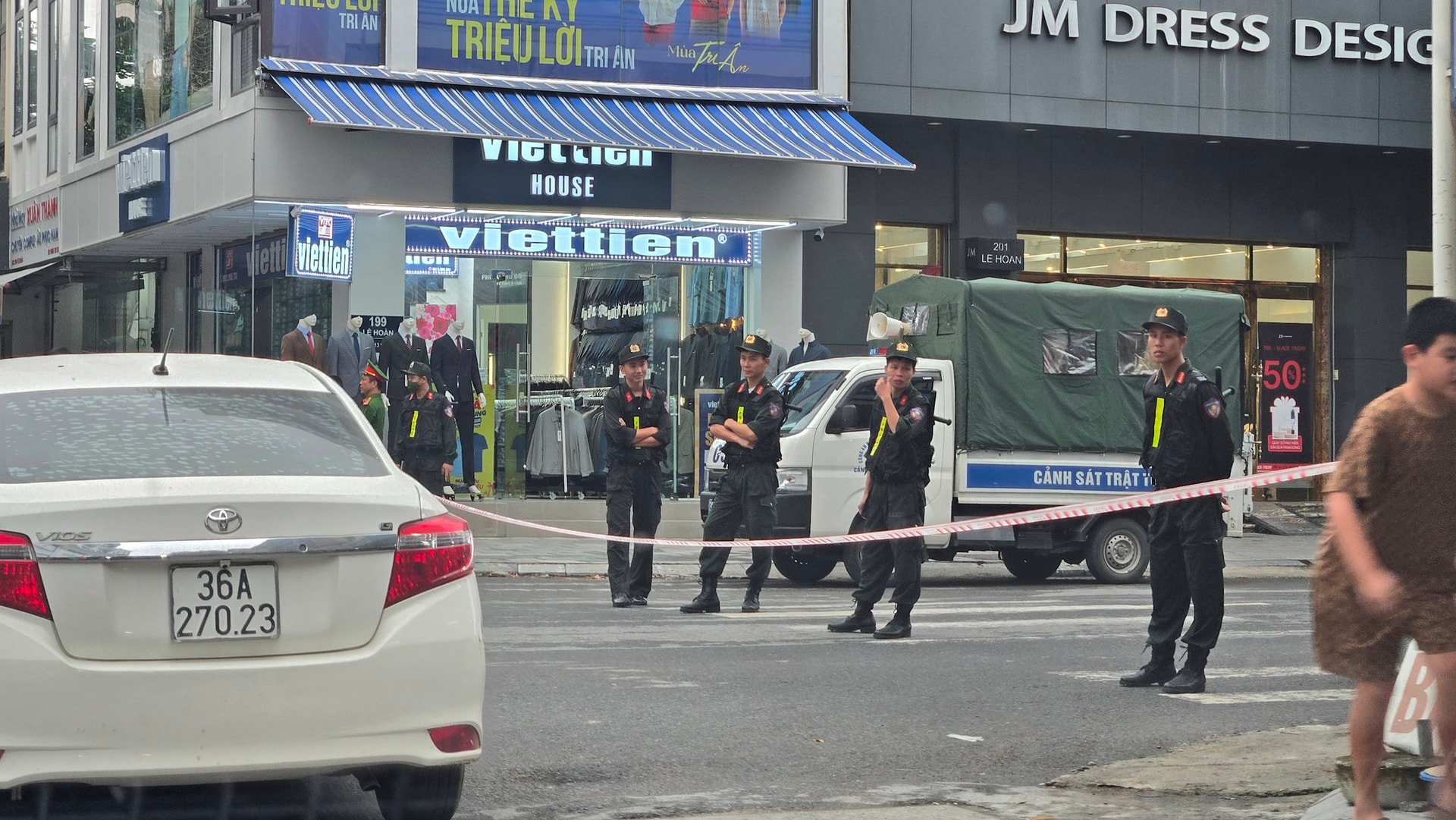 Theo ghi nhận trực tiếp tại hiện trường, một đoạn phố Lê Hoàn đã bị phong tỏa hoàn toàn bằng dây cảnh báo.
