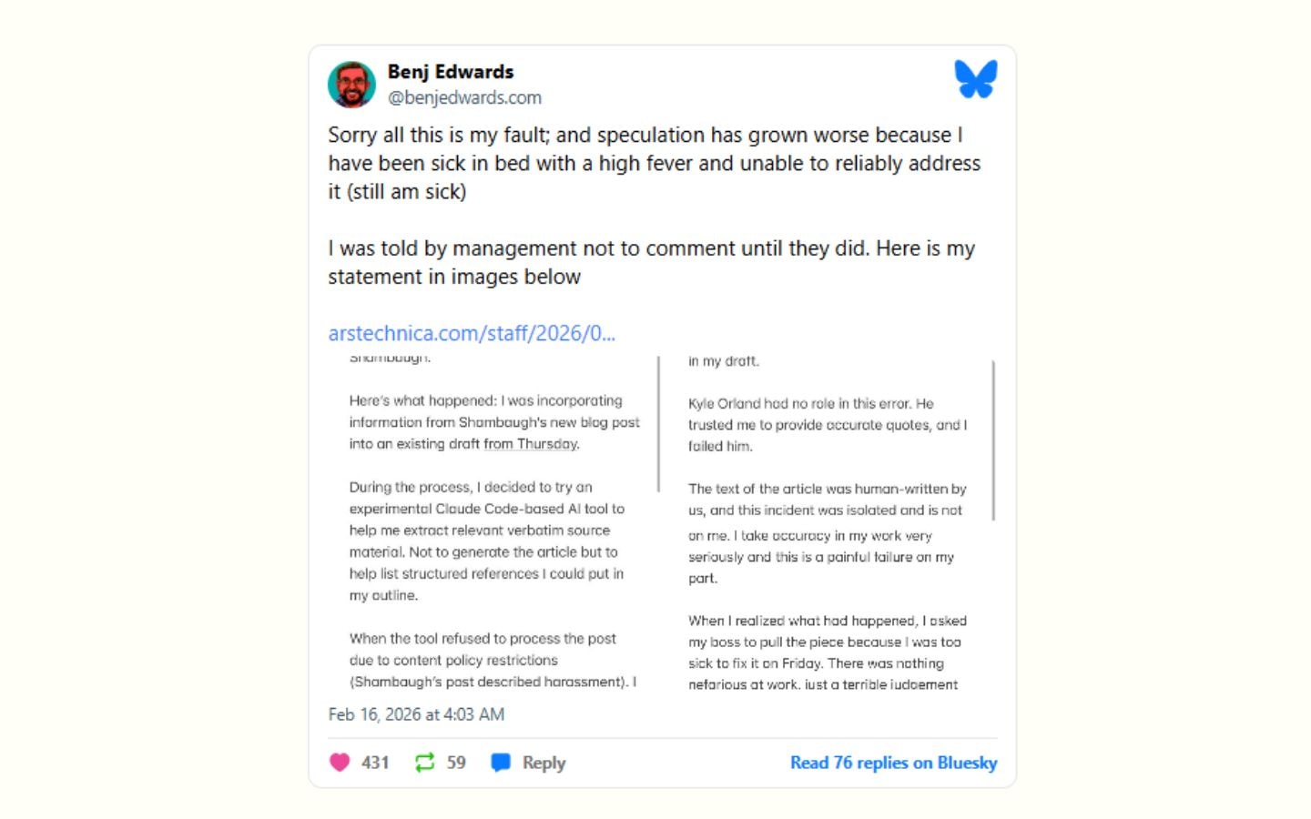 Giải thích về sự cố trên mạng xã hội Bluesky, Benj Edwards thừa nhận sai lầm và cho biết ông đã làm việc trong tình trạng sức khỏe không ổn định do nhiễm COVID-19 và sốt cao. Trong nỗ lực trích xuất các đoạn văn từ một bài blog khác, ông đã sử dụng một công cụ AI thử nghiệm dựa trên Claude Code.