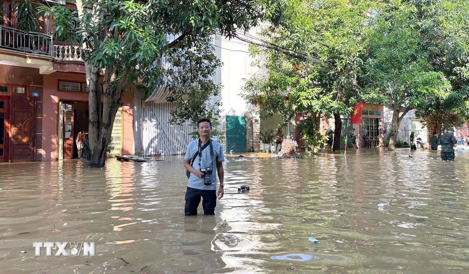 Phóng viên Đỗ Tuấn Anh, Cơ quan thường trú Lào Cai, tác nghiệp tại khu vực ngập lụt do ảnh hưởng của cơn bão số 10 ở phường Yên Bái. (Ảnh: TTXVN)