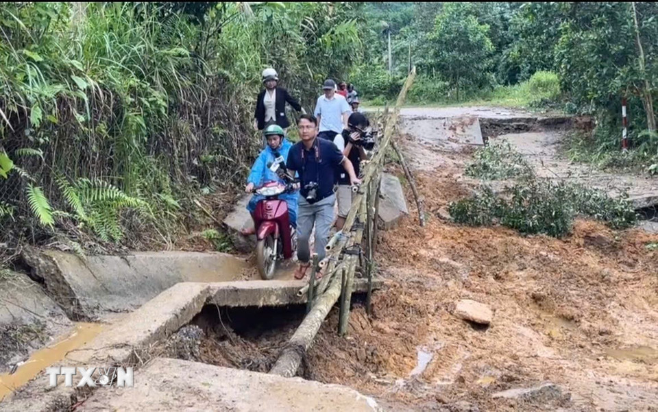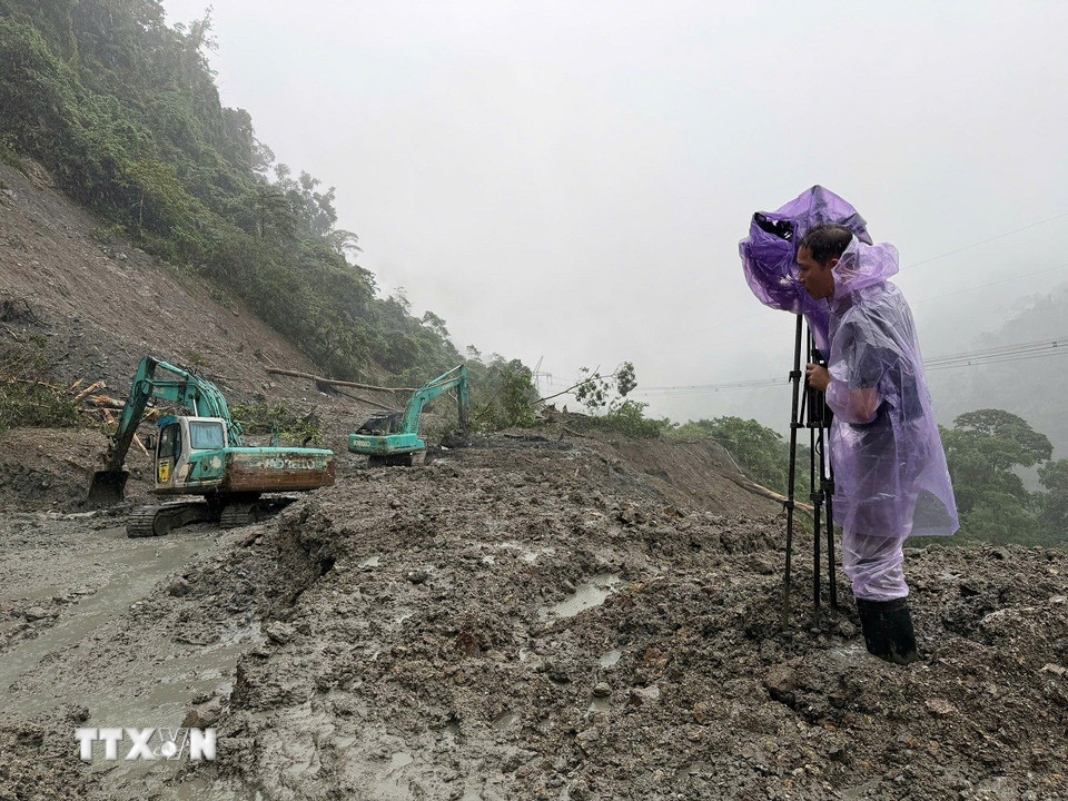 Phóng viên Phạm Cường, Cơ quan thường trú Quảng Ngãi, tác nghiệp hiện trường vụ sạt lở do ảnh hưởng của bão số 13. (Ảnh: TTXVN)