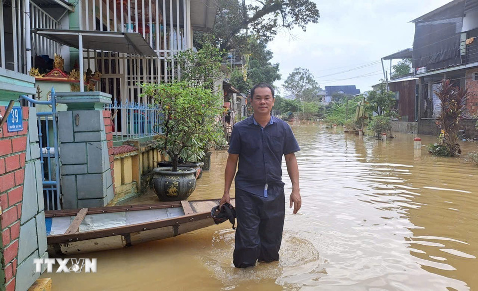 Phóng viên Văn Dũng, Cơ quan thường trú Thông tấn xã Việt Nam tại Huế, tác nghiệp tại rốn lũ phường Hóa Châu, thành phố Huế. (Ảnh: TTXVN)