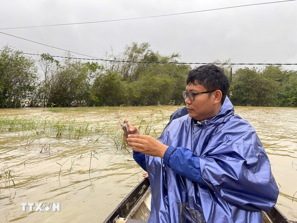 Phóng viên Nguyễn Tường Quân, Cơ quan thường trú Đắk Lắk, tác nghiệp trong đợt mưa lũ. (Ảnh: TTXVN)
