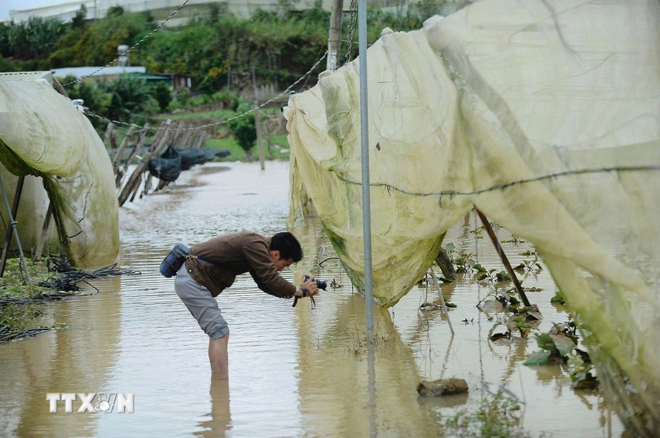 Phóng viên Nguyễn Dũng, Cơ quan thường trú Lâm Đồng, tác nghiệp tại vùng lũ Đơn Dương. (Ảnh: TTXVN)