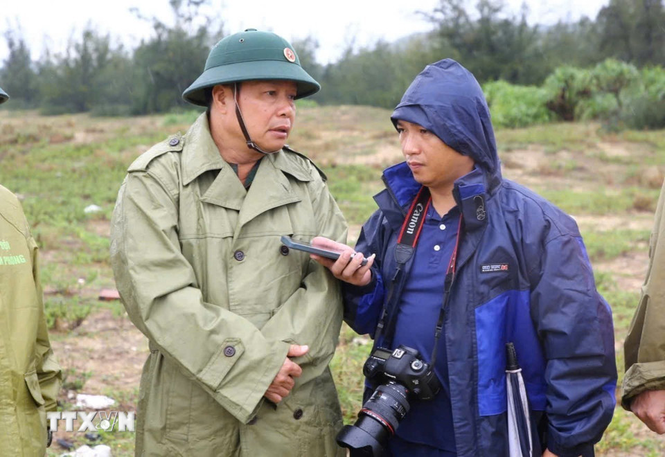 Phóng viên Tá Chuyên, Cơ quan thường trú Thông tấn xã Việt Nam tại Quảng Trị, tác nghiệp hiện trường. (Ảnh: TTXVN)
