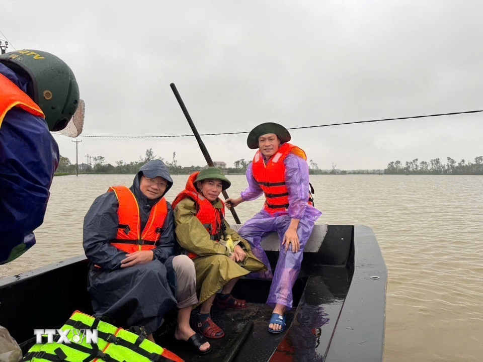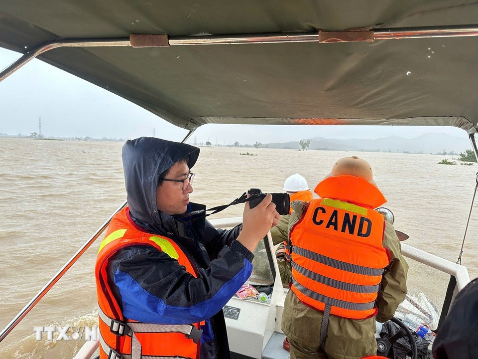 Nhóm phóng viên Cơ quan thường trú Hà Tĩnh tác nghiệp hiện trường mưa lũ ở xã Cẩm Duệ, tỉnh Hà Tĩnh. (Ảnh: TTXVN)