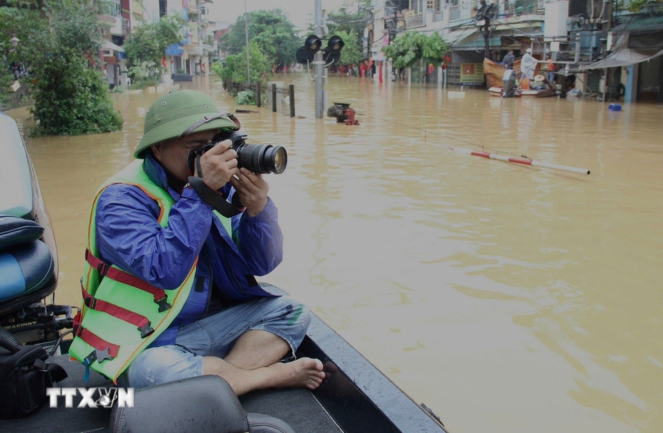 Nhóm phóng viên Cơ quan thường trú Thông tấn xã Việt Nam tại Lào Cai tác nghiệp tại khu vực ngập lụt do ảnh hưởng của cơn bão số 10 ở phường Yên Bái. (Ảnh: TTXVN)