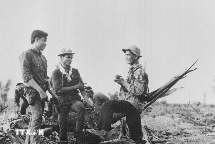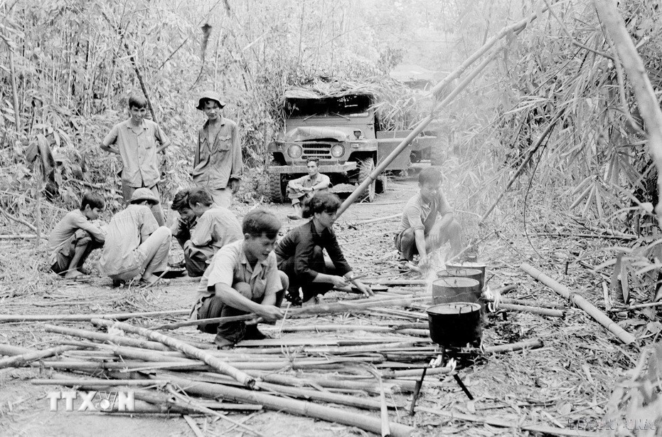 Chặng dừng chân của đoàn phóng viên GP 10 của Việt Nam Thông tấn xã trên đường vào Chiến dịch Hồ Chí Minh để chi viện cho Thông tấn xã Giải phóng. (Ảnh: Tư liệu TTXVN)