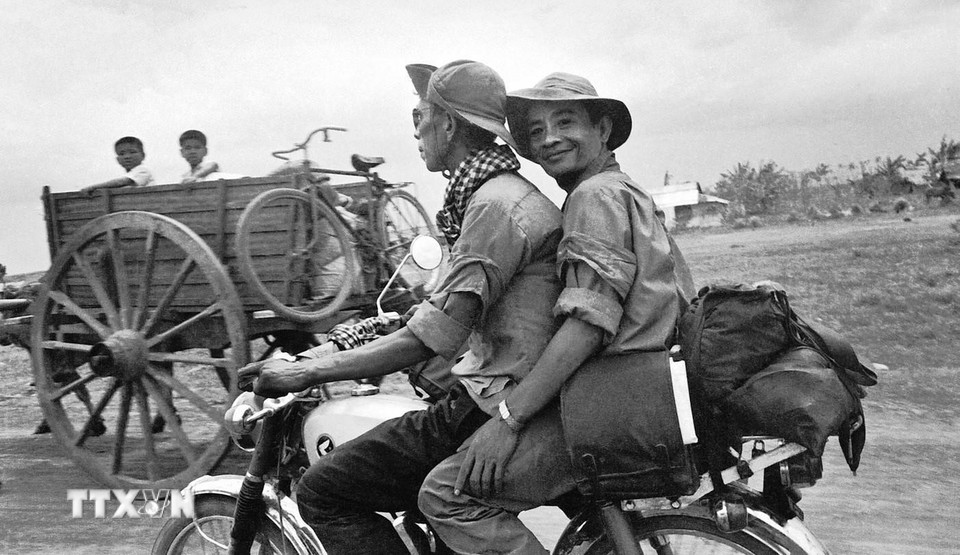 Phóng viên Thông tấn xã Giải phóng Nguyễn Đức Giáp (ngồi sau) cùng đồng nghiệp trên đường tiến về Sài Gòn trong Chiến dịch Hồ Chí Minh, tháng 4/1975. (Ảnh: TTXVN)