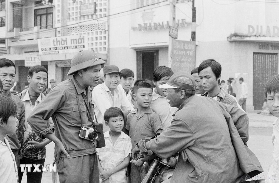 Phóng viên Hứa Kiểm của Việt Nam Thông tấn xã gặp gỡ quần chúng nhân dân Sài Gòn để đưa tin, ảnh về thắng lợi của Chiến dịch Hồ Chí Minh lịch sử 1975, giải phóng hoàn toàn miền Nam, thống nhất đất nước. (Ảnh: TTXVN)