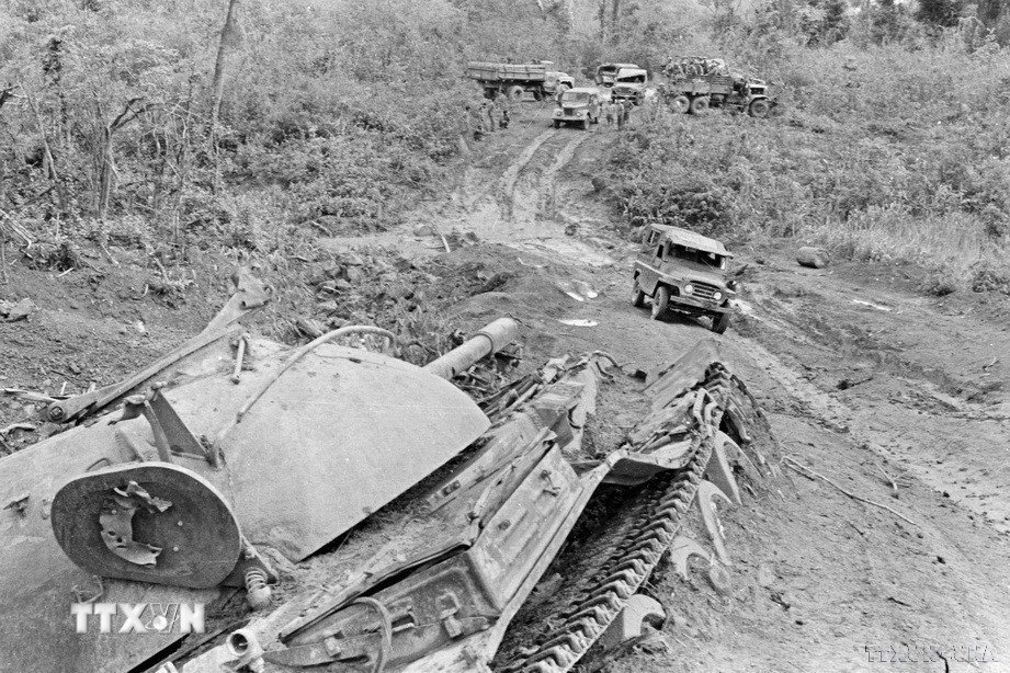 Đoàn xe của cán bộ Việt Nam Thông tấn xã vượt Trường Sơn vào chi viện cho chiến trường. (Ảnh: TTXVN)