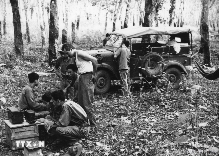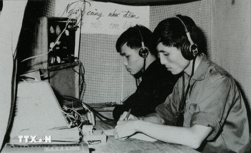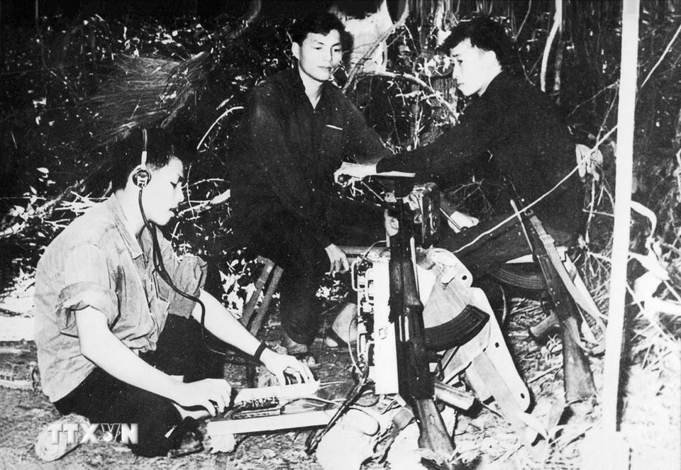 Tổ điện báo Thông tấn xã Giải phóng điện tin từ mặt trận về căn cứ. (Ảnh: TTXVN)