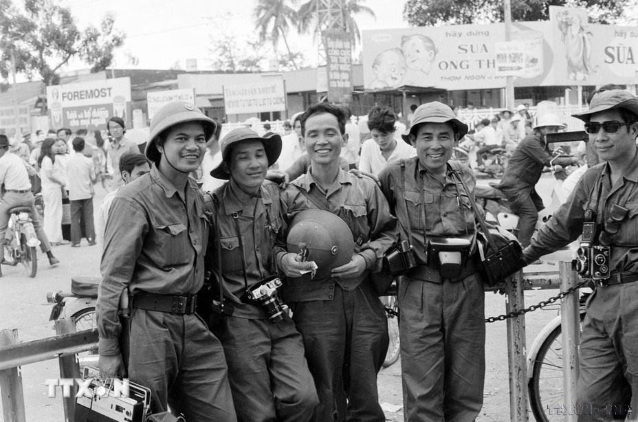 Phóng viên Thông tấn xã Giải phóng và Việt Nam Thông tấn xã tham gia đưa tin trong Chiến dịch Hồ Chí Minh, tháng 4/1975. (Ảnh: TTXVN)