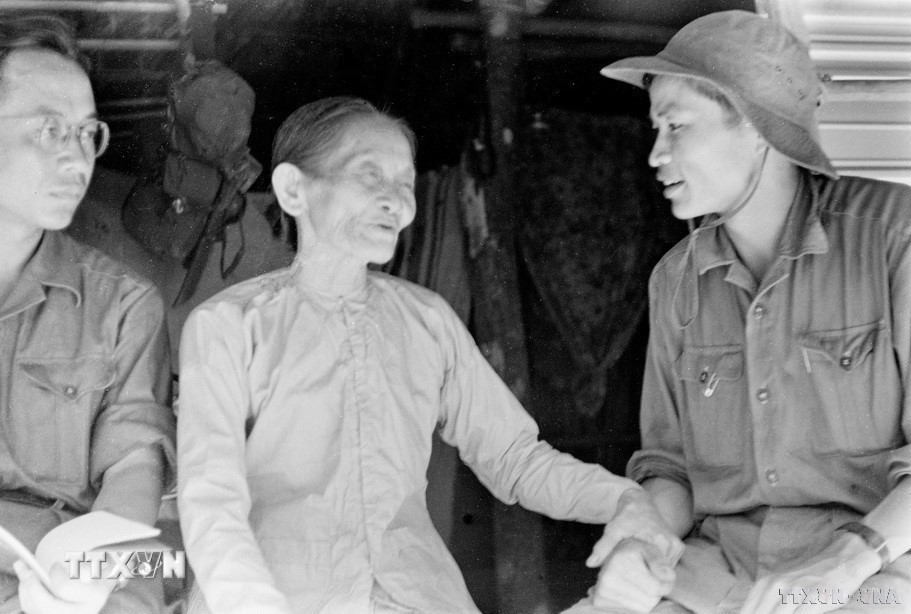 Phóng viên Dương Thanh Phong (đội mũ), phóng viên Thông tấn xã Giải phóng tại Quảng Trị nói chuyện với mẹ Chắt, cơ sở nuôi cán bộ cách mạng tại thị xã Quảng Trị. (Ảnh: TTXVN)