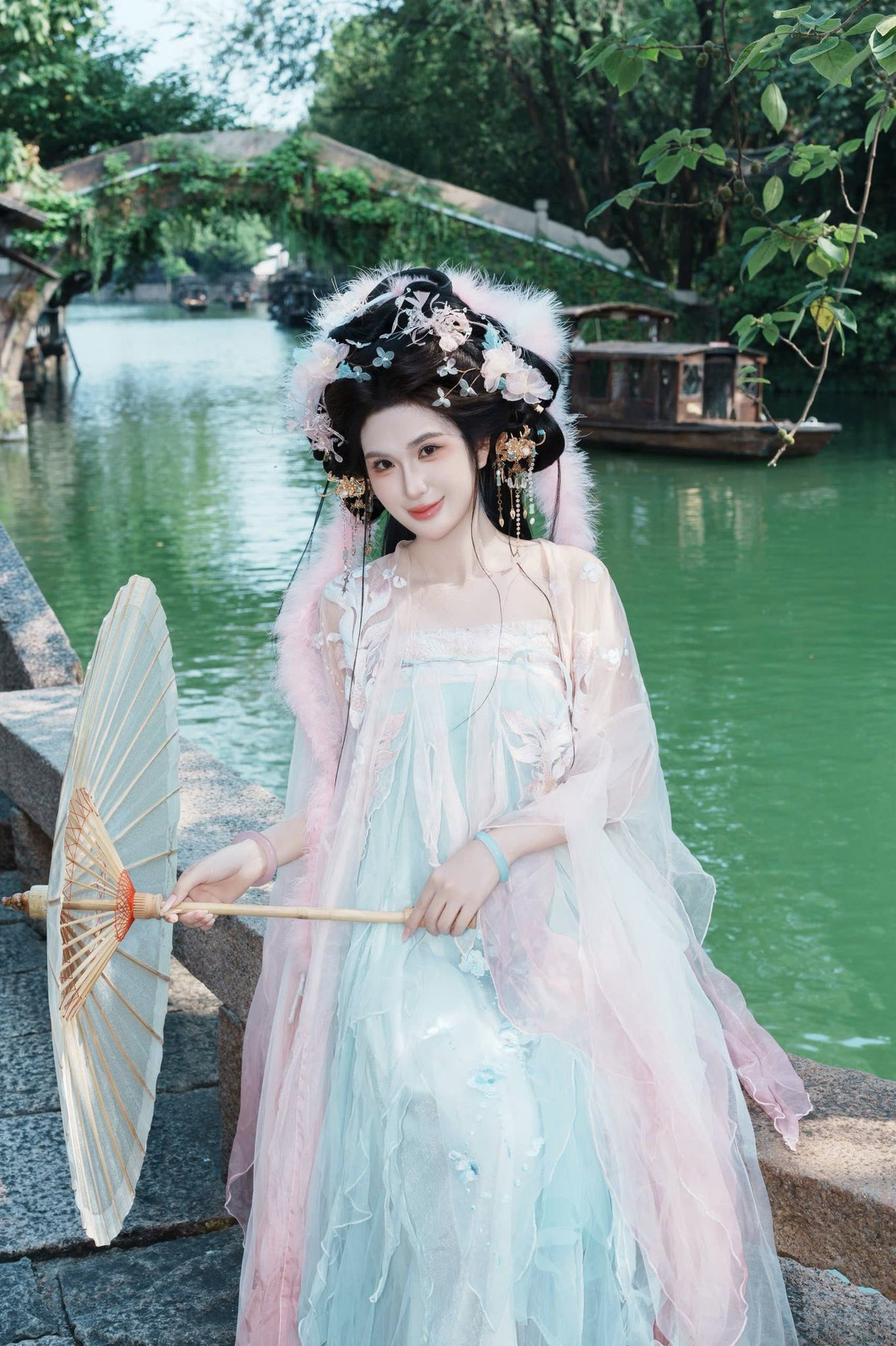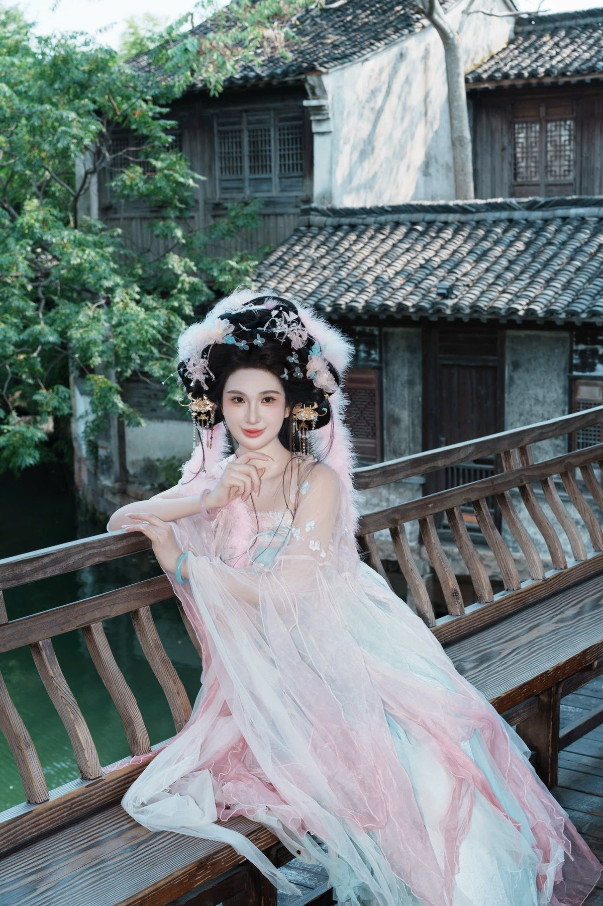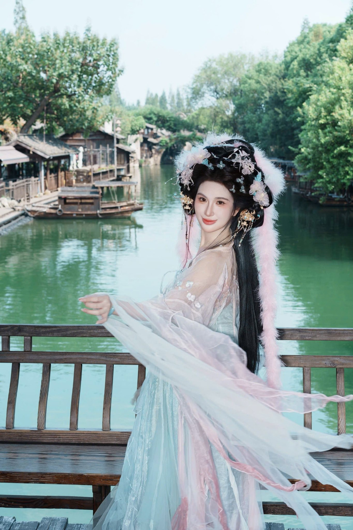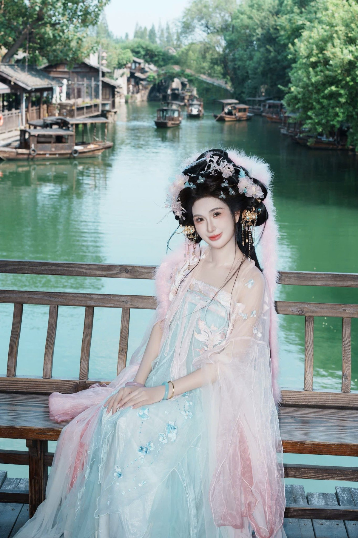 Ngọc Loan đưa người xem đến một cổ trấn đậm chất Trung Hoa. Giữa những căn nhà gỗ rêu phong và dòng kênh xanh biếc, cô khoác lên mình bộ Hán phục với sự kết hợp màu sắc vô cùng tinh tế. (Ảnh: FBNV)