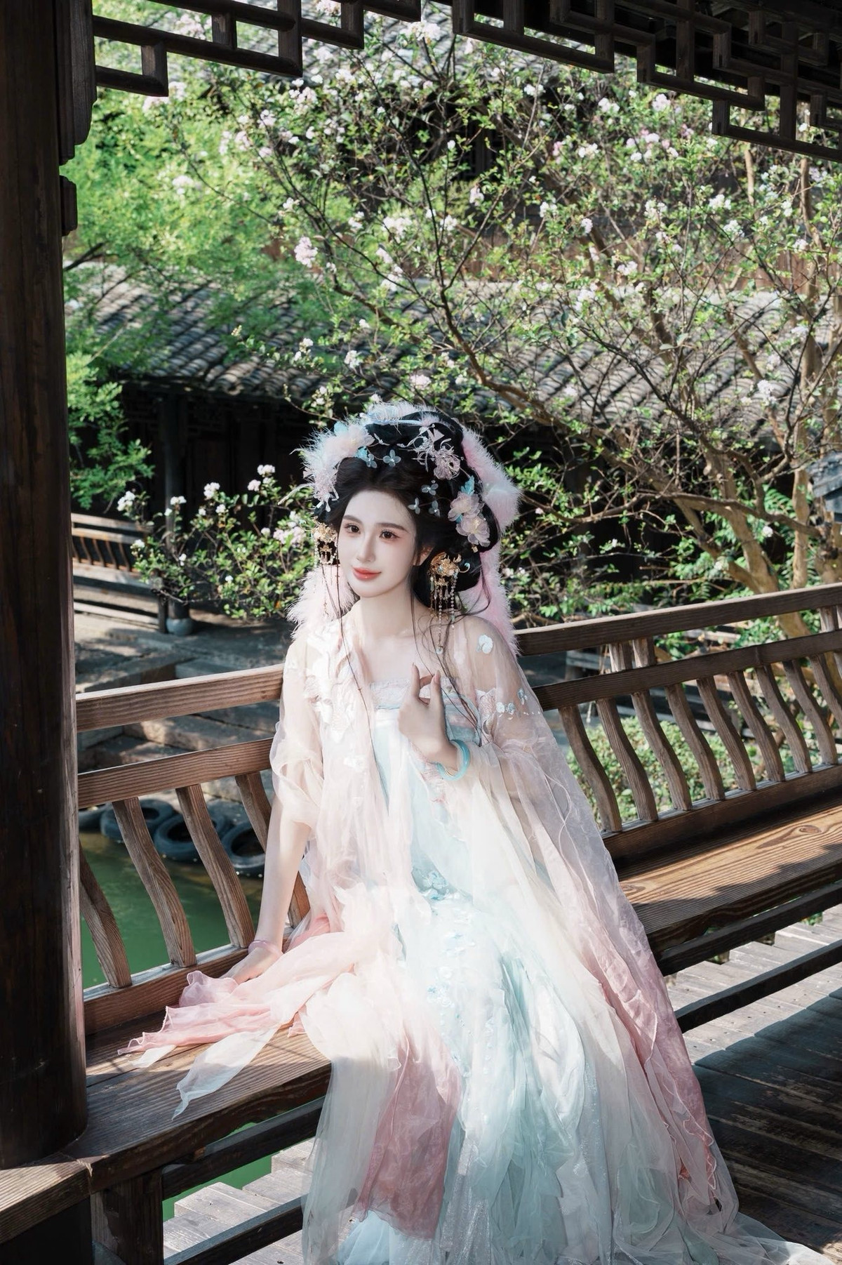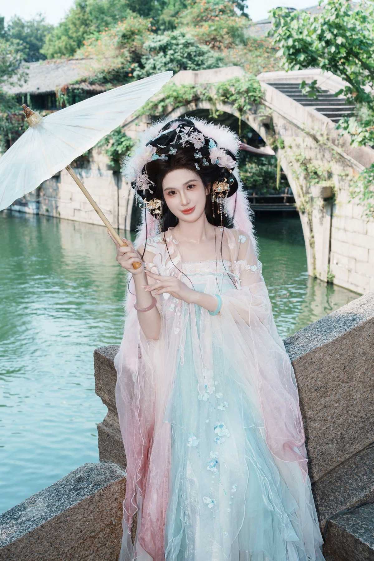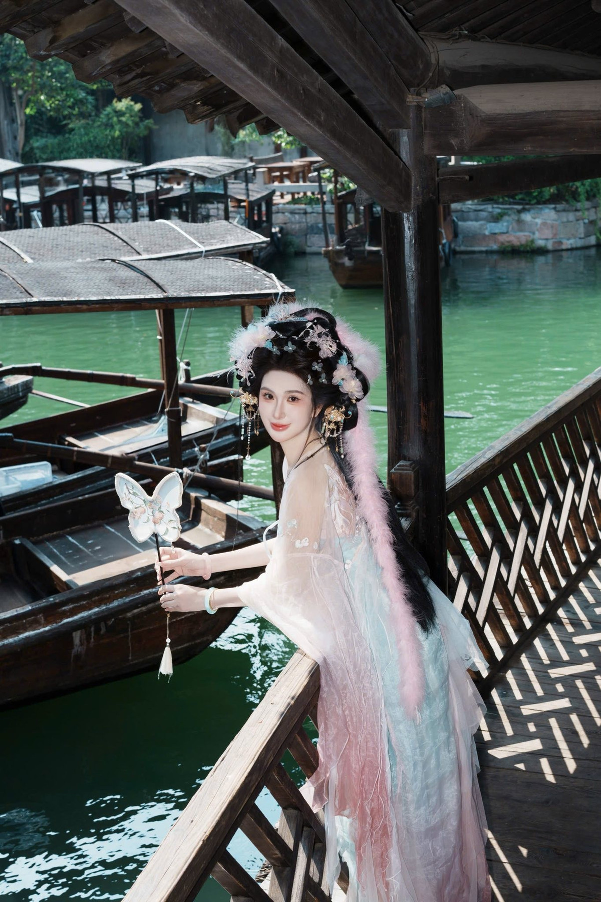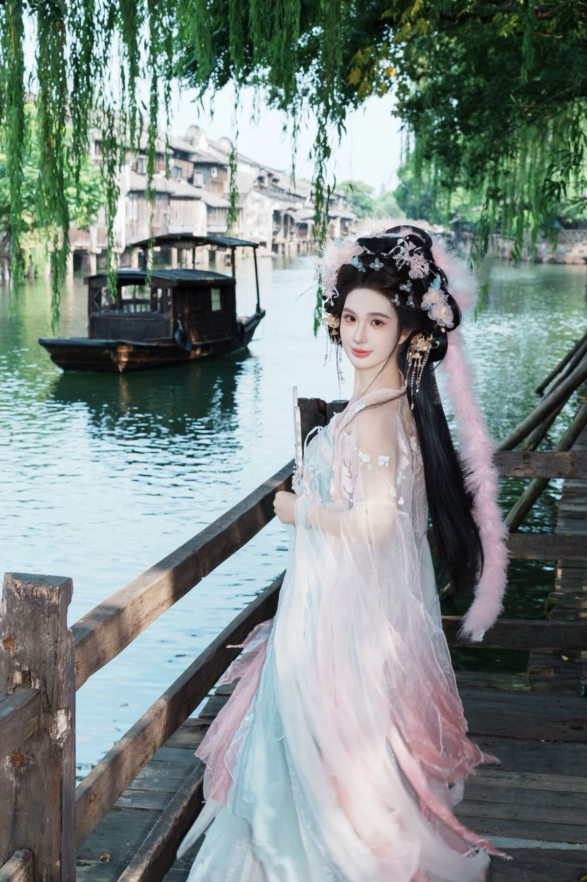 Ngọc Loan đưa người xem đến một cổ trấn đậm chất Trung Hoa. Giữa những căn nhà gỗ rêu phong và dòng kênh xanh biếc, cô khoác lên mình bộ Hán phục với sự kết hợp màu sắc vô cùng tinh tế. (Ảnh: FBNV)