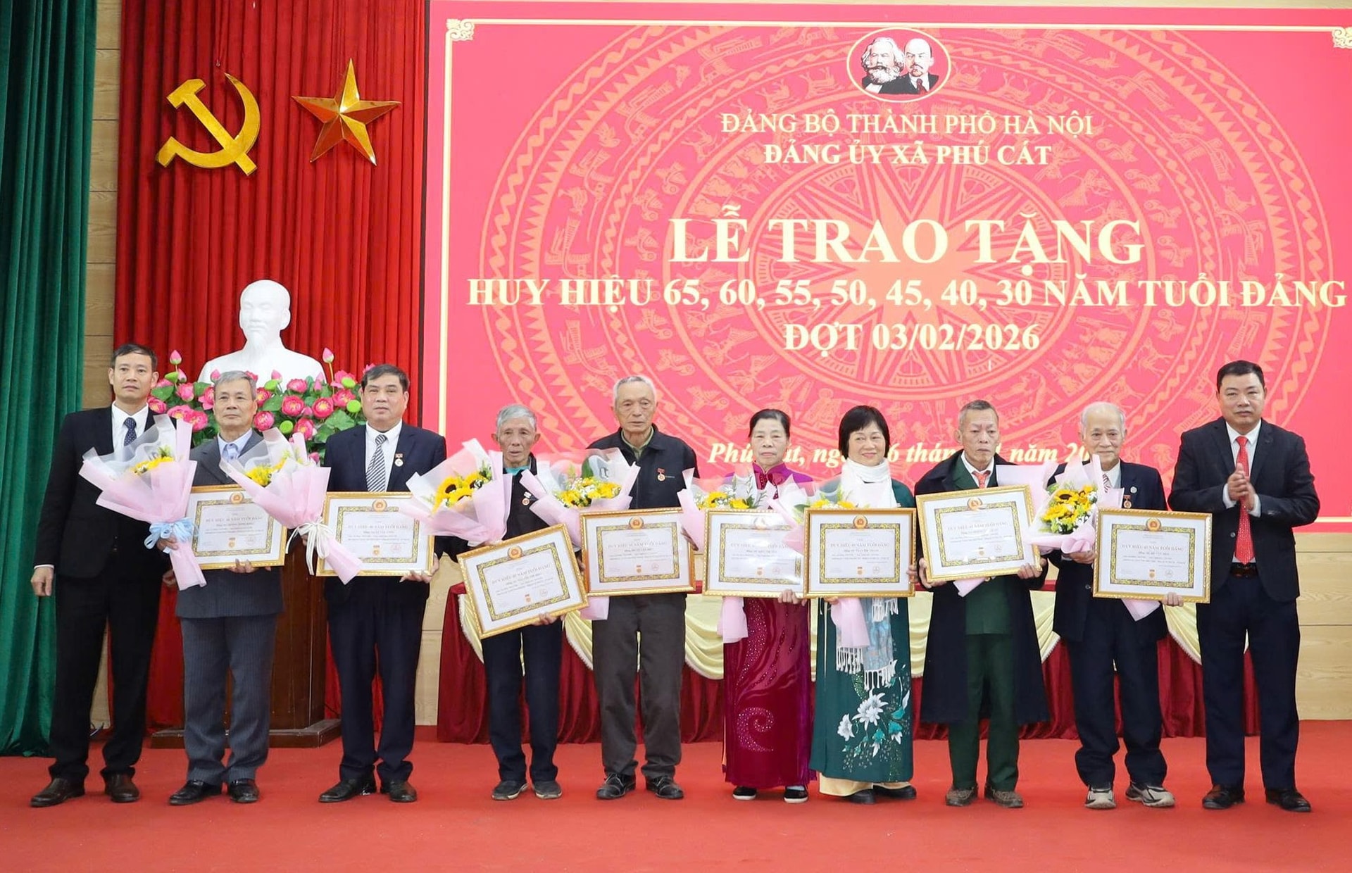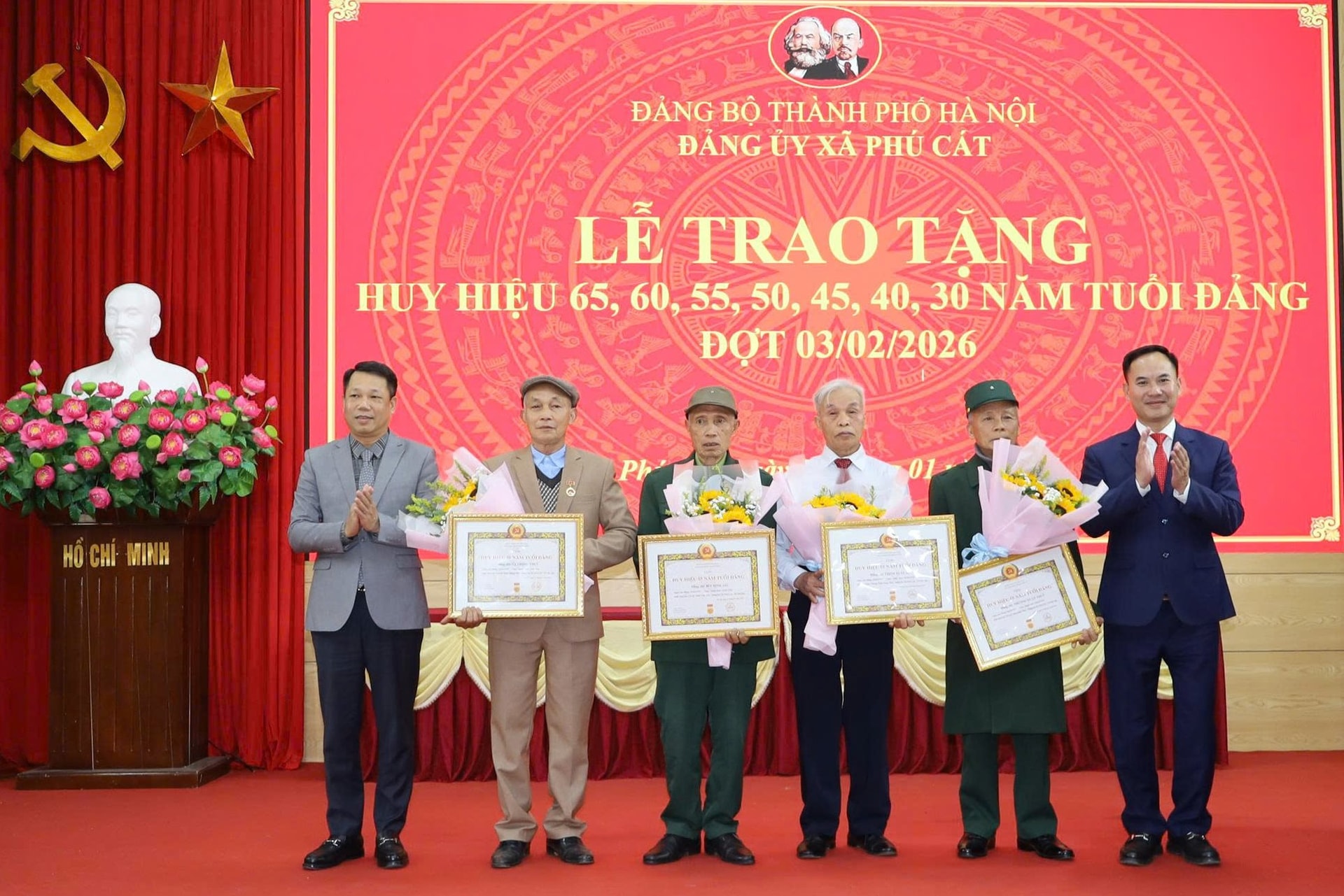 Trong đợt này, Đảng bộ xã Phú Cát có 1 đảng viên nhận Huy hiệu 65 năm tuổi Đảng, 3 đảng viên nhận Huy hiệu 60 năm tuổi Đảng, 3 đảng viên nhận Huy hiệu 55 năm tuổi Đảng, 1 đảng viên nhận Huy hiệu 50 năm tuổi Đảng, 6 đảng viên nhận Huy hiệu 45 năm tuổi Đảng, 10 đảng viên nhận Huy hiệu 40 năm tuổi Đảng và 1 đảng viên nhận Huy hiệu 30 năm tuổi Đảng.