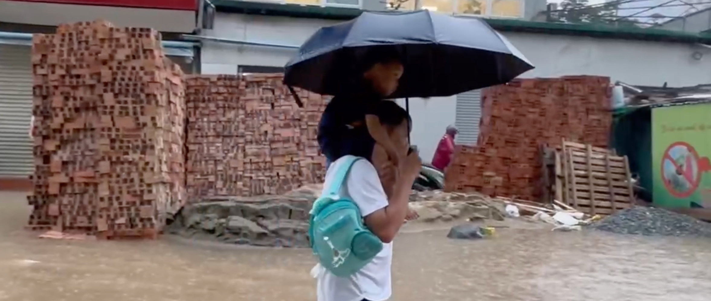 Chị Thùy Dung chia sẻ hai mẹ con chị đã lội nước 3km để đi từ trường về nhà, quãng đường tuy không quá xa nhưng di chuyển giữa mưa ngập khiến chị vừa thương vừa lo lắng cho con.