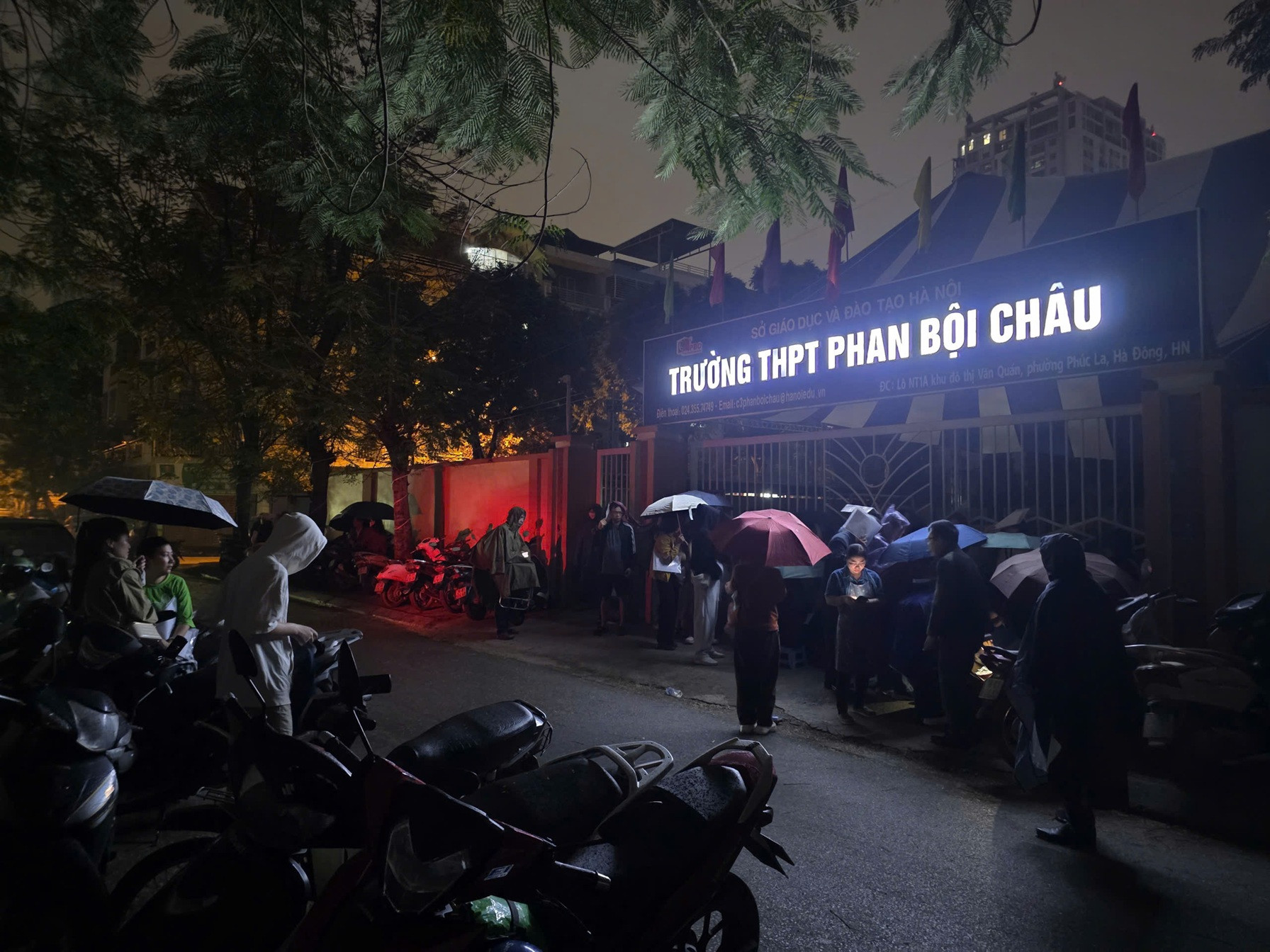 Tới gần 6h, trời đổ mưa, các phụ huynh di chuyển qua khu vực mái hiên của tòa nhà đối diện cổng trường để tránh trú. Số ít vẫn cầm ô và mặc áo mưa, tiếp tục đứng đợi ở cổng trường. Tới gần 8h, danh sách đăng ký “tự lập” của các phụ huynh đã lên tới gần 300 người. Không ít người đăng ký thêm Trường THPT Phan Bội Châu cho con để làm phương án dự phòng nếu trượt lớp 10 công lập.