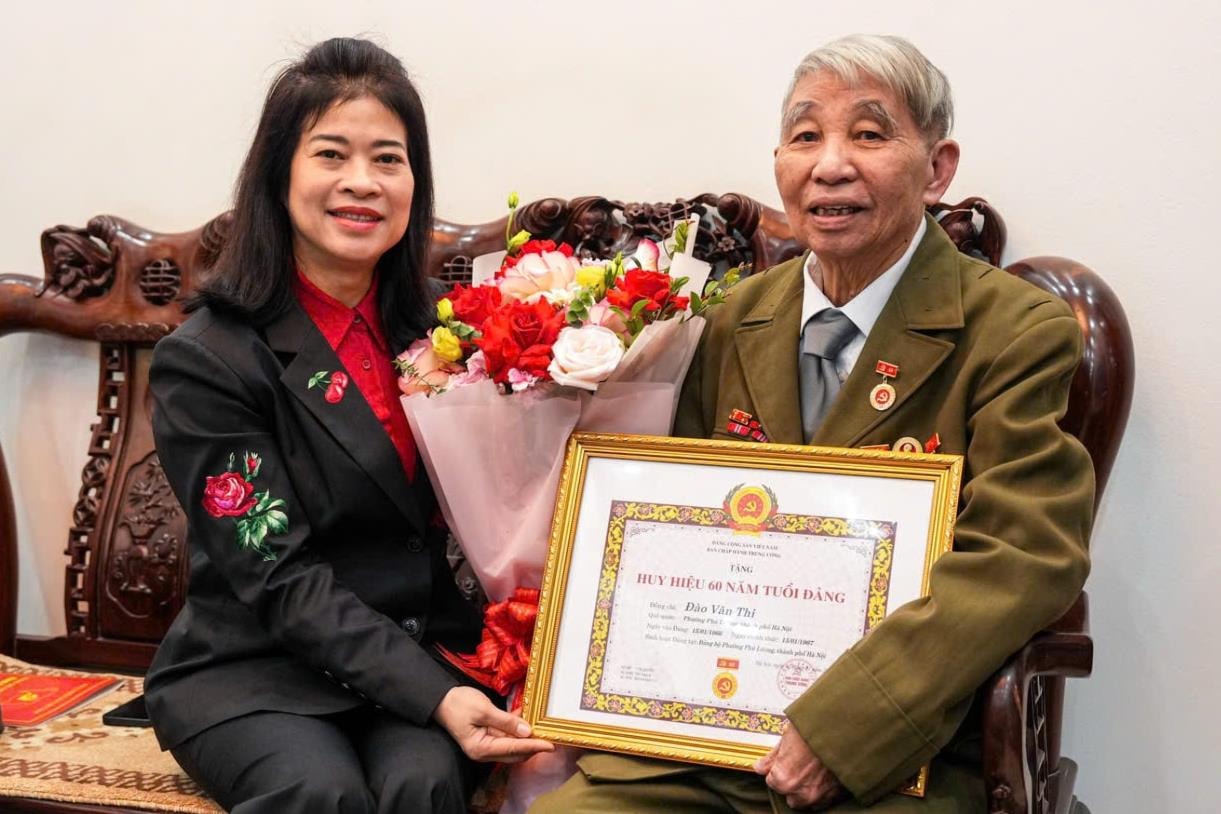 Phó Bí thư Thường trực Đảng ủy phường Phú Lương Đoàn Thị Thu Hà trao Huy hiệu Đảng tặng đảng viên lão thành Đào Văn Thi. Ảnh: PV
