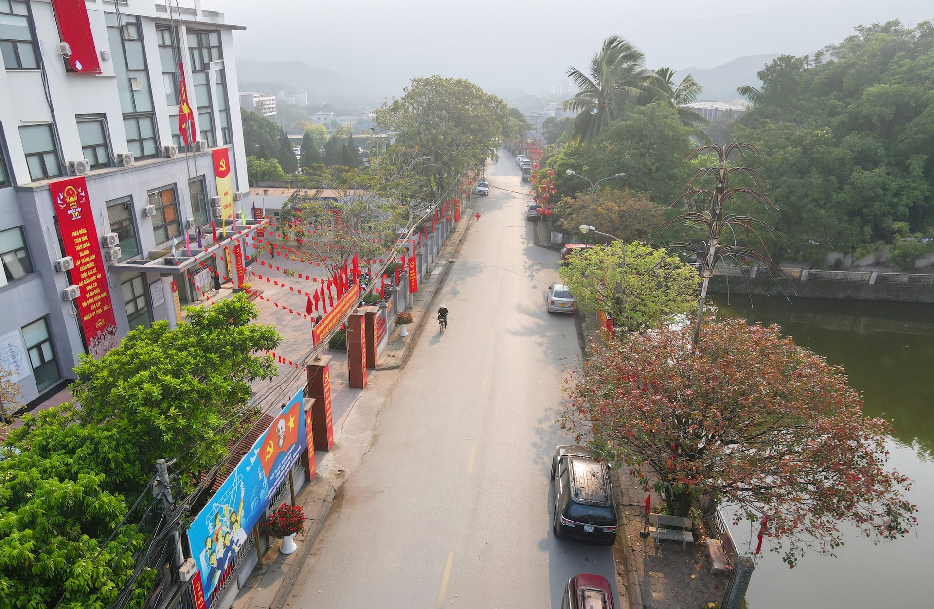 Đường phố sạch đẹp, cờ hoa trang hoàng rực rỡ tại phường Phú Lương ngày 14-3. Ảnh: Hữu Tiệp