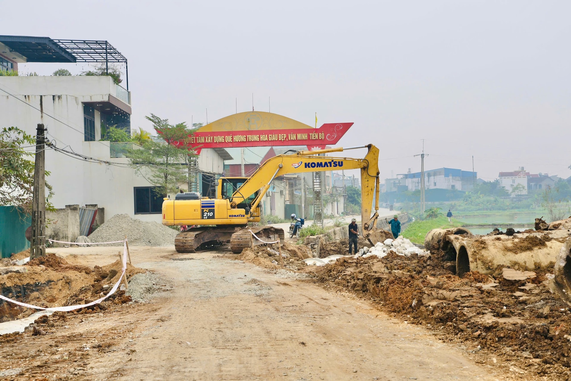 Bí thư Đảng ủy, Chủ tịch HĐND xã Phú Nghĩa Trịnh Tiến Tường kiểm tra tiến độ thi công tuyến đường từ quốc lộ 6 đi Trung Hòa. Ảnh: Kim Thoa