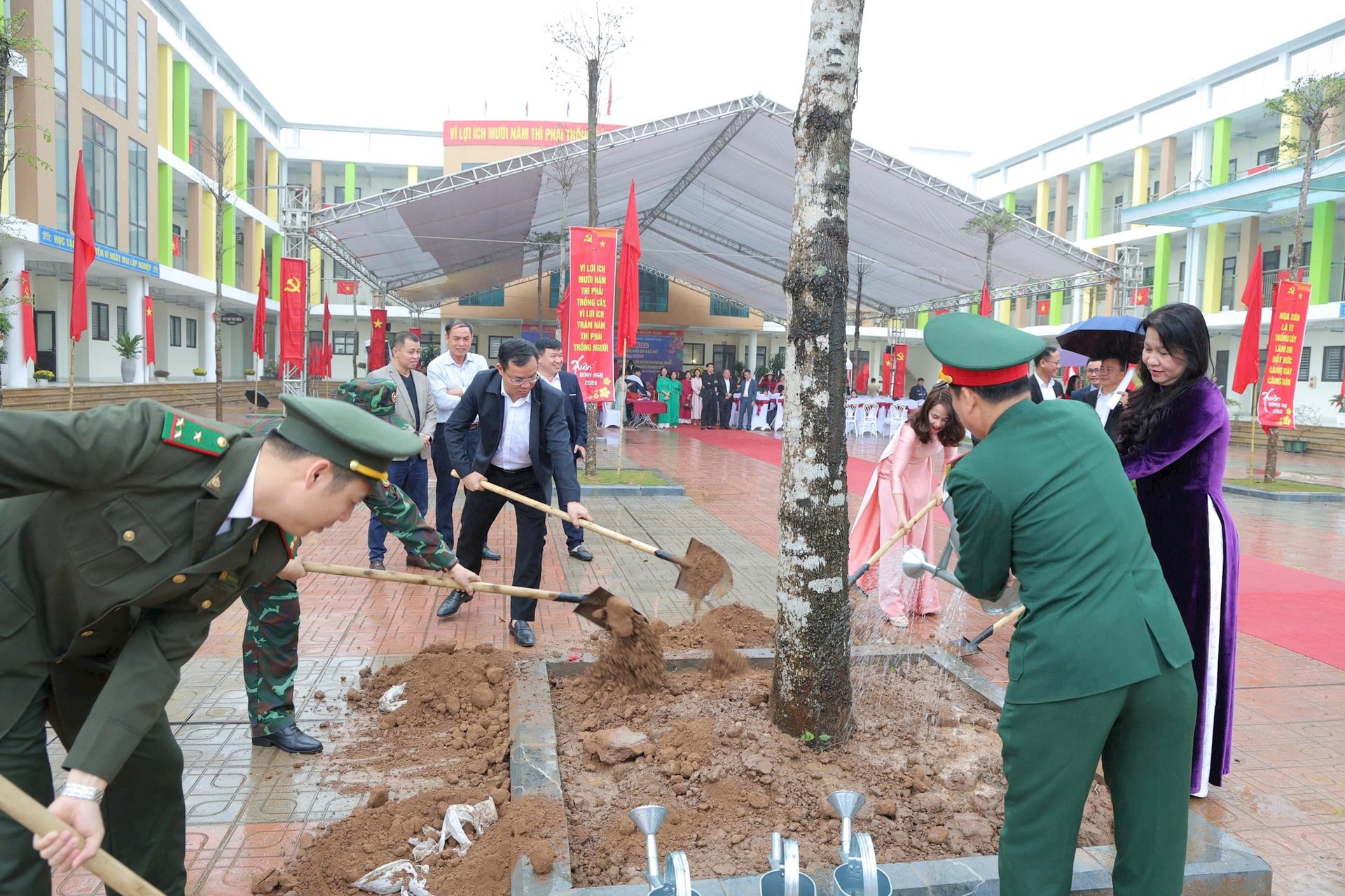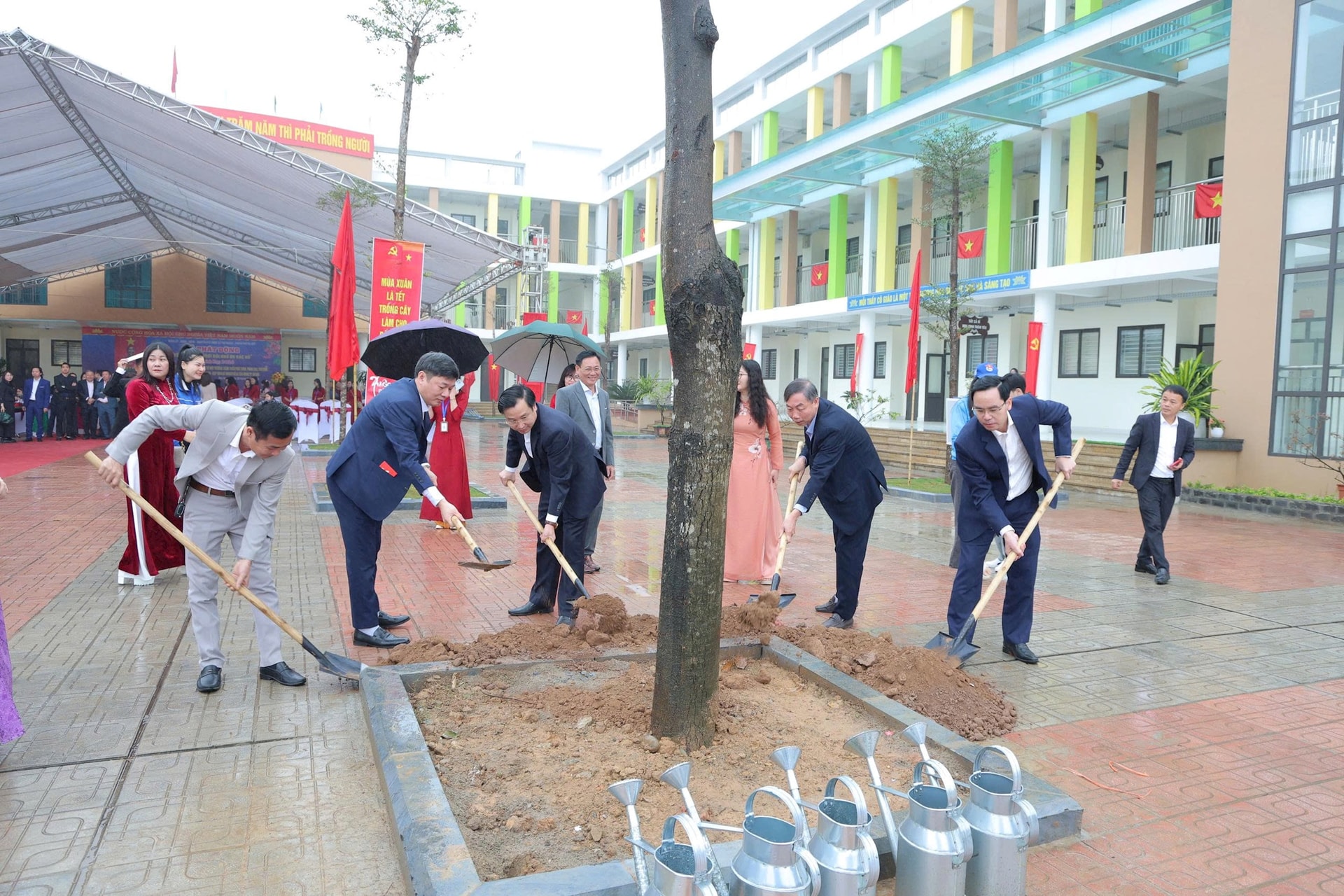 Chi cục trưởng Chi cục Chăn nuôi, Thủy sản và Thú y Hà Nội Nguyễn Đình Đảng và lãnh đạo xã Phú Nghĩa trồng cây xanh tại Trường THCS Trung Hòa sáng 22-2. Ảnh: Kim Thoa