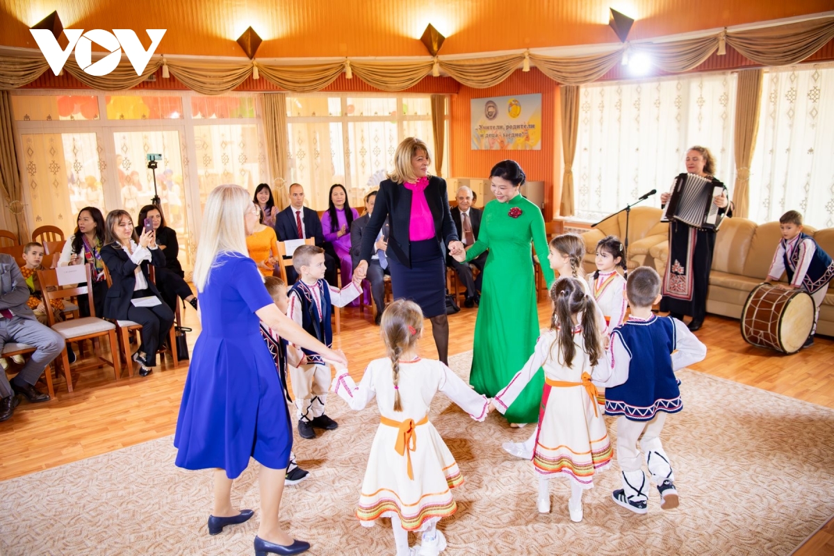 Tại đây, hai Phu nhân cùng thưởng thức các tiết mục văn nghệ do các em nhỏ biểu diễn, với những khúc ca Việt Nam và Bulgaria ngân vang, rộn rã. Đặc biệt, hai Phu nhân nắm tay các em nhỏ hòa mình trong điệu nhảy dân gian Bulgaria - những bước nhảy vui tươi, hồn nhiên, như những nhịp cầu kết nối hai nền văn hóa.