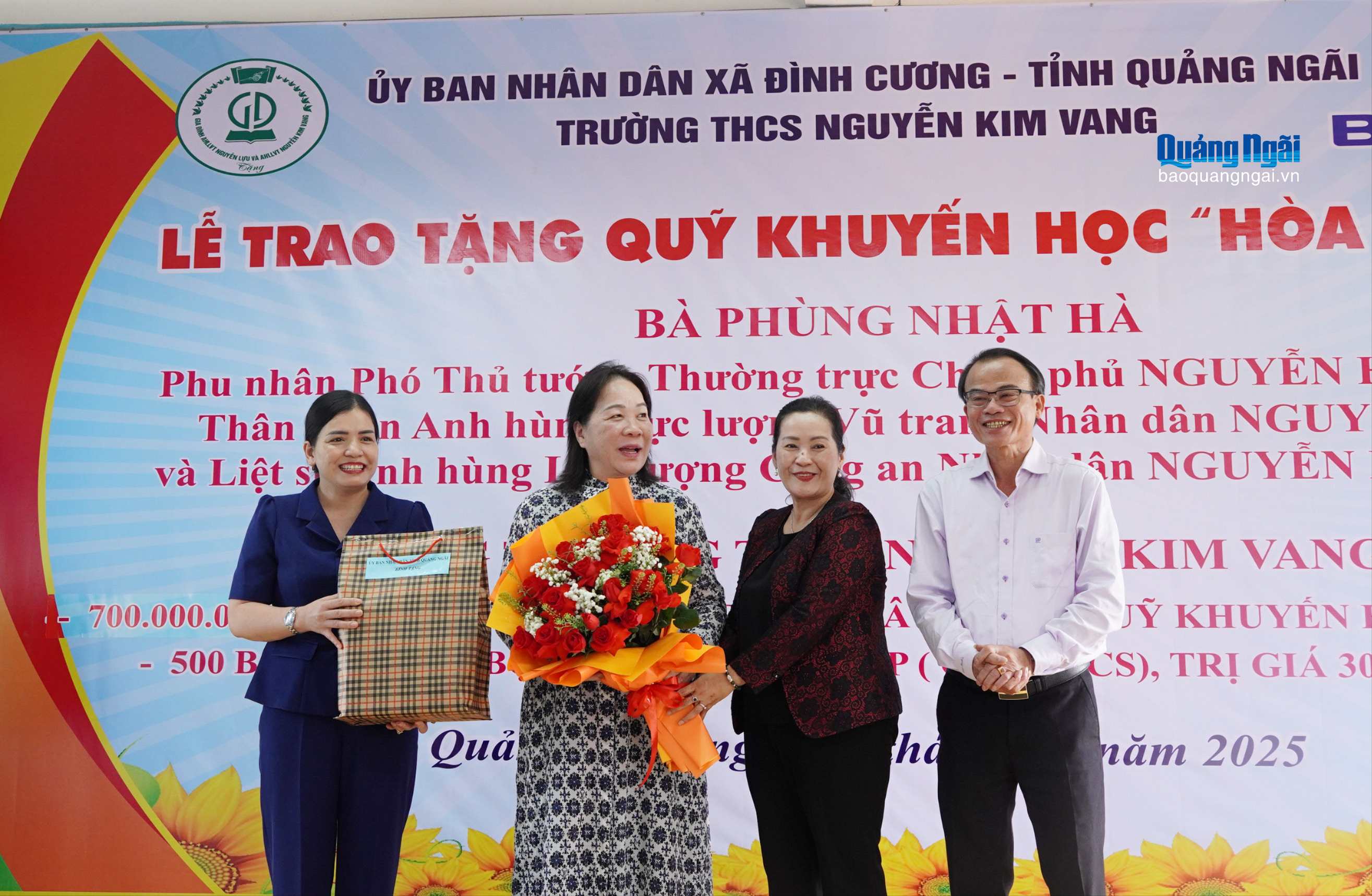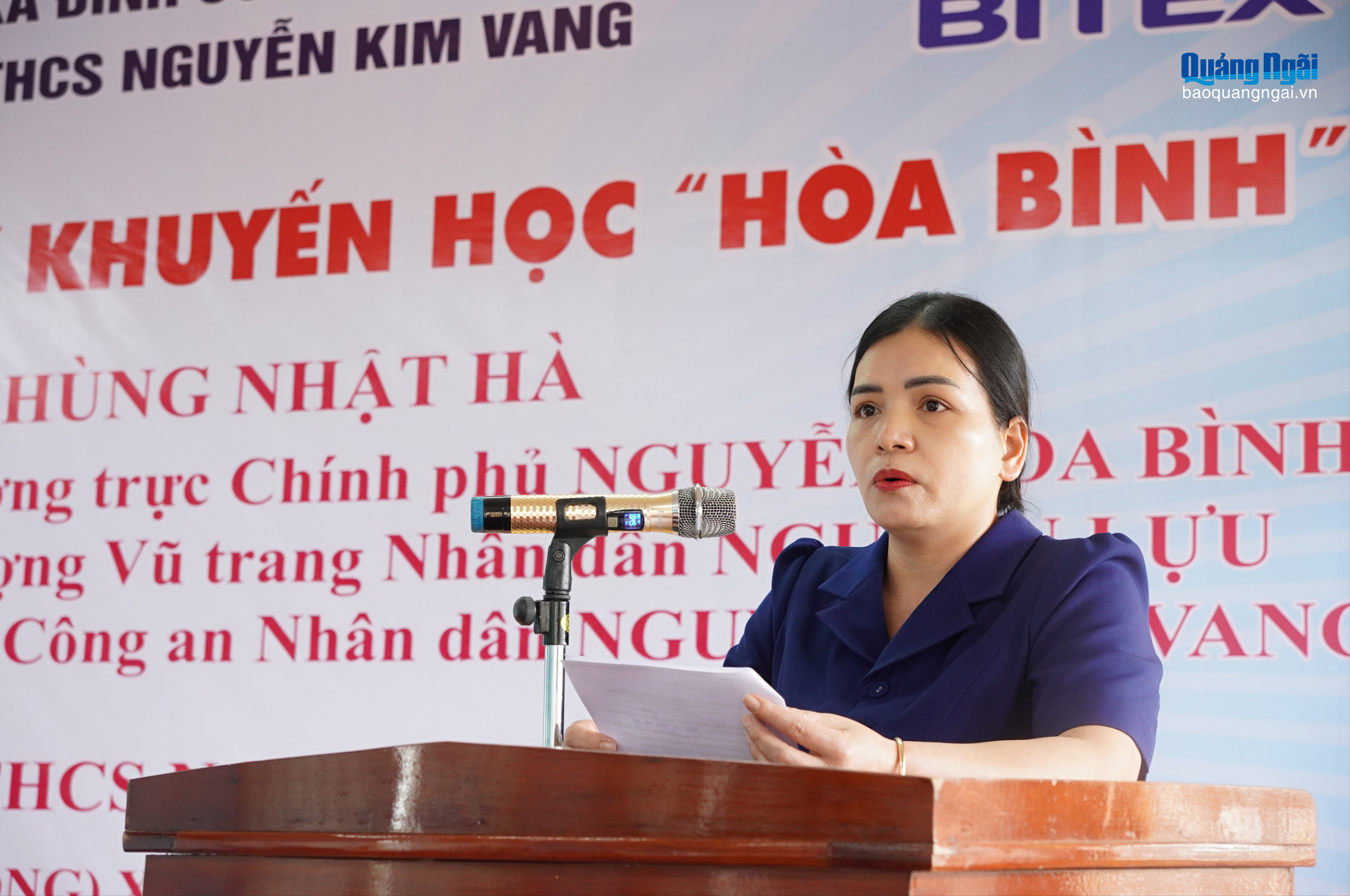 Phát biểu tại buổi lễ trao tặng, bà Phùng Nhật Hà, phu nhân Ủy viên Bộ Chính trị, Phó Thủ tướng Thường trực Chính phủ Nguyễn Hòa Bình chia sẻ với những thiệt hại, khó khăn của người dân miền Trung do thiên tai gây ra trong thời gian qua. Để góp phần động viên, khích lệ thầy, trò Trường THCS Nguyễn Kim Vang, bà Phùng Nhật Hà và các tấm lòng đã quyên góp, trực tiếp mang theo các phần quà để tặng cho các em học sinh.