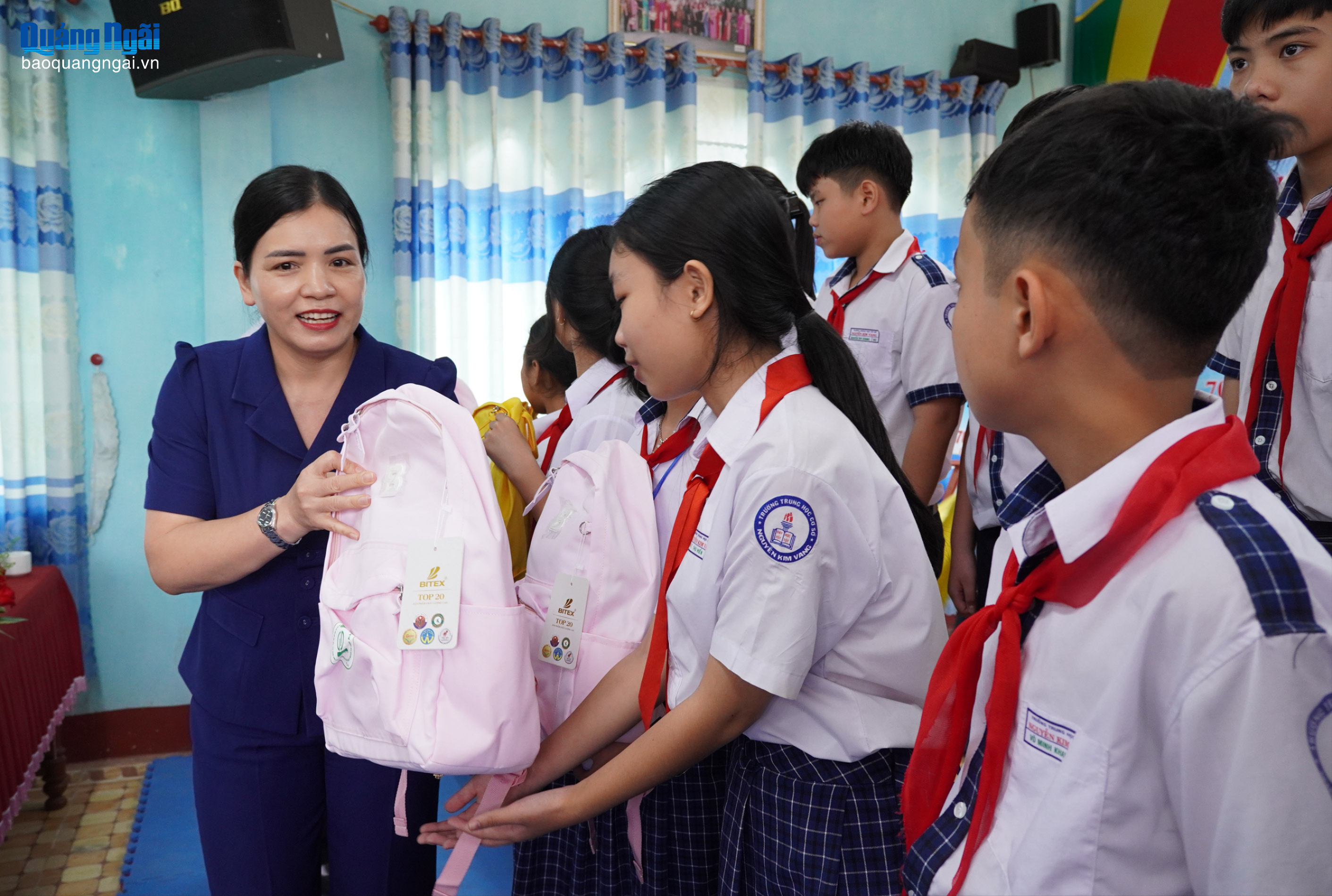 Phó Bí thư Tỉnh ủy Đinh Thị Hồng Minh trao quà của đoàn công tác đến các em học sinh.