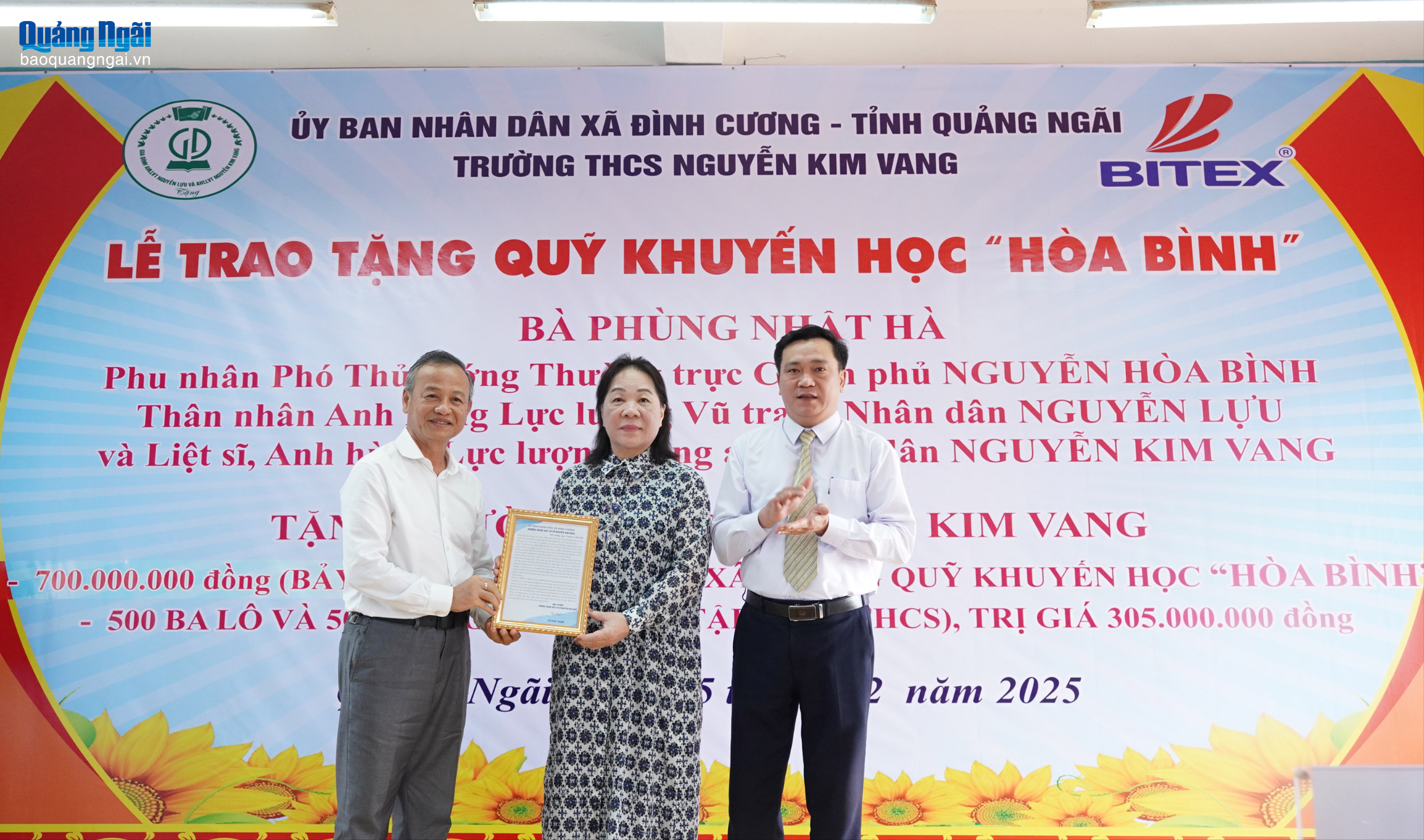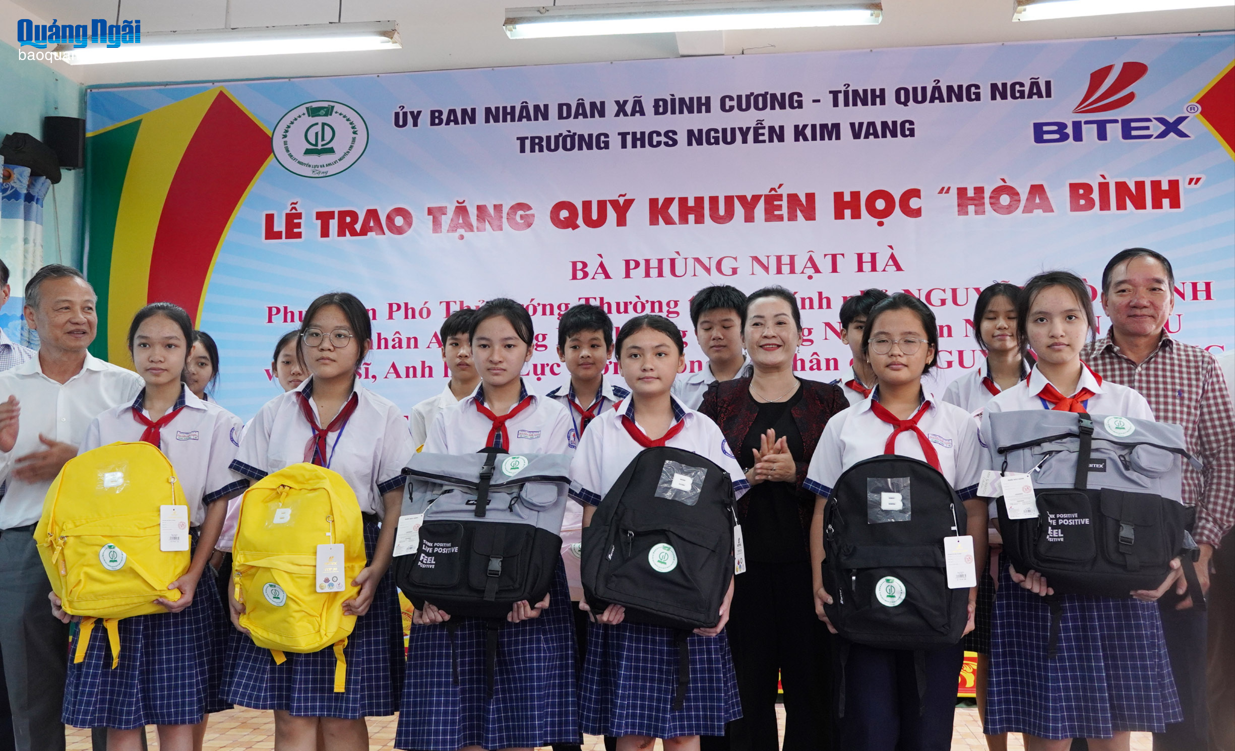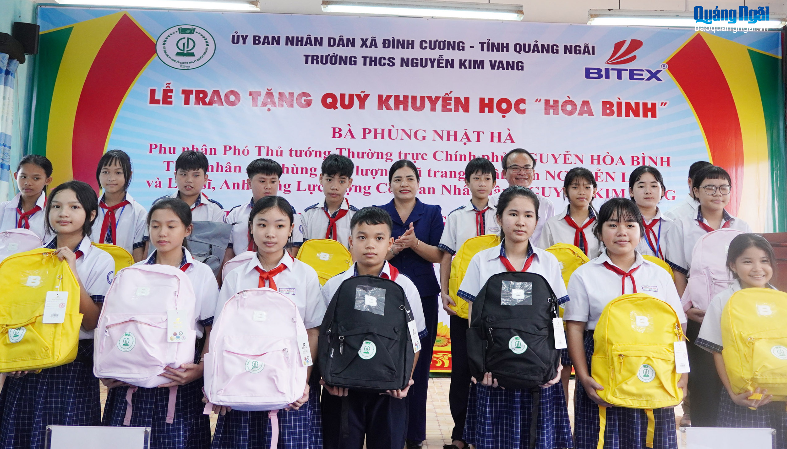 Tại buổi lễ, bà Phùng Nhật Hà đã trao bảng tượng trưng tặng 700 triệu đồng Quỹ khuyến học Hòa Bình cho Trường THCS Nguyễn Kim Vang. Đoàn đã tặng 500 phần quà, mỗi phần quà ba lô và đồ dùng học tập, tổng trị giá hơn 300 triệu đồng cho các em học sinh Trường THCS Nguyễn Kim Vang.