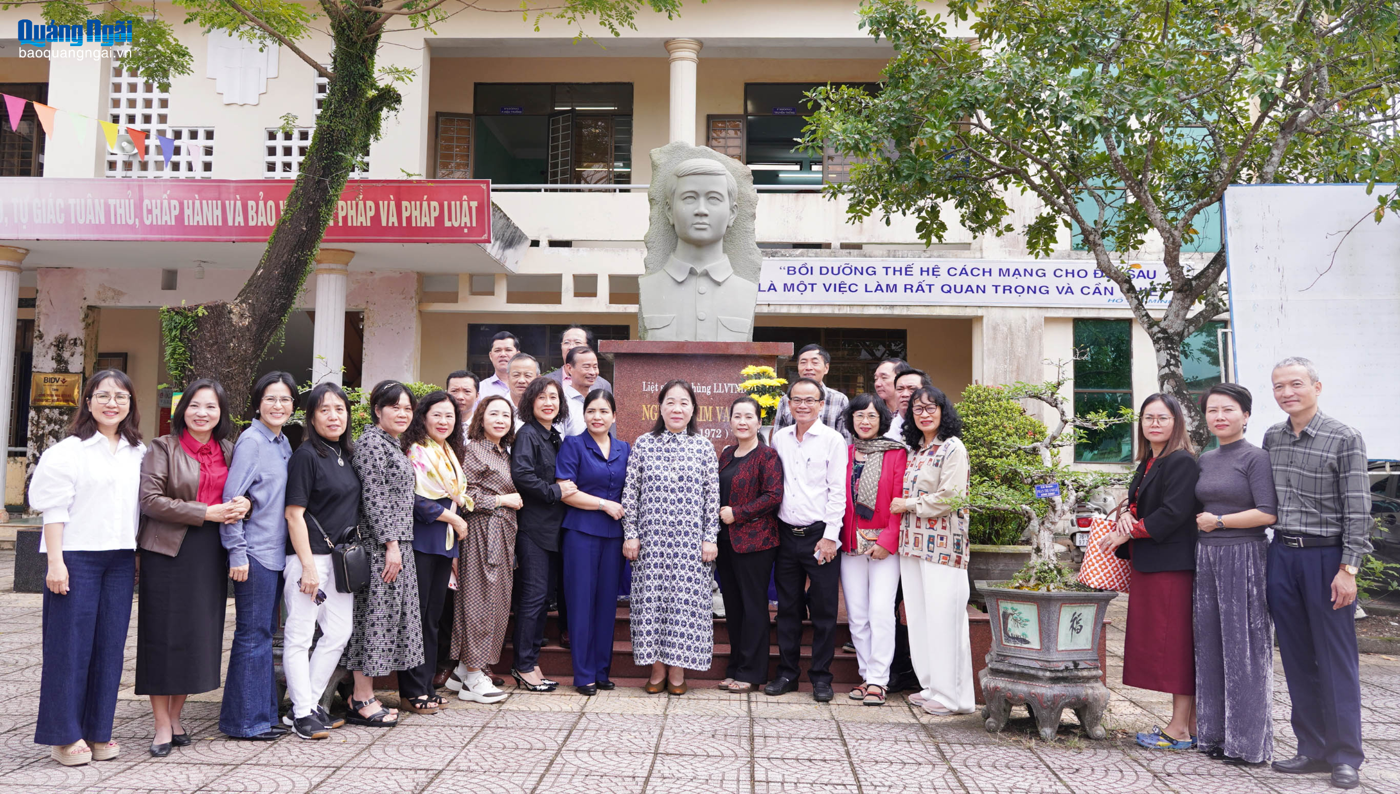 Bà Phùng Nhật Hà chụp hình kỷ niệm niệm cùng các đồng chí lãnh đạo tỉnh, thành viên trong đoàn trước tượng đài liệt sĩ, Anh hùng Lực lượng vũ trang nhân dân Nguyễn Kim Vang trong sân trường.