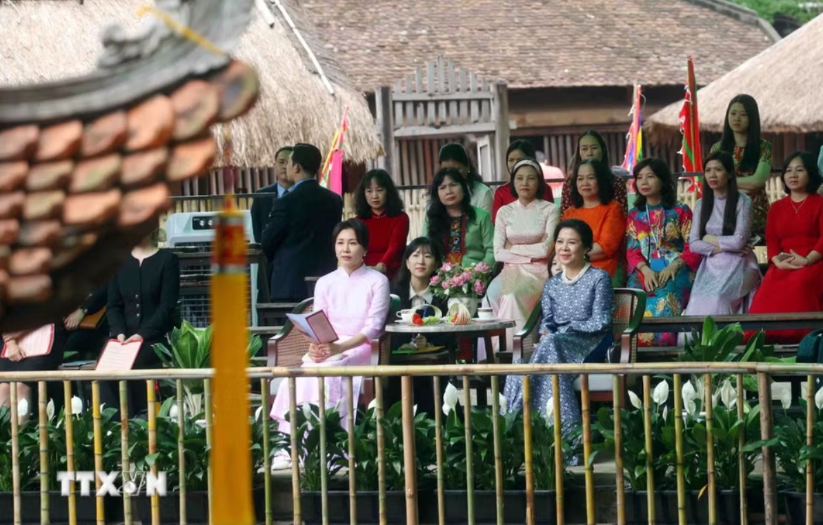 Hai Phu nhân tham quan không gian nhà truyền thống “hanok”, một số Lễ Tết cổ truyền và đời sống hiện đại của Hàn Quốc ngày nay. Ảnh: TTXVN