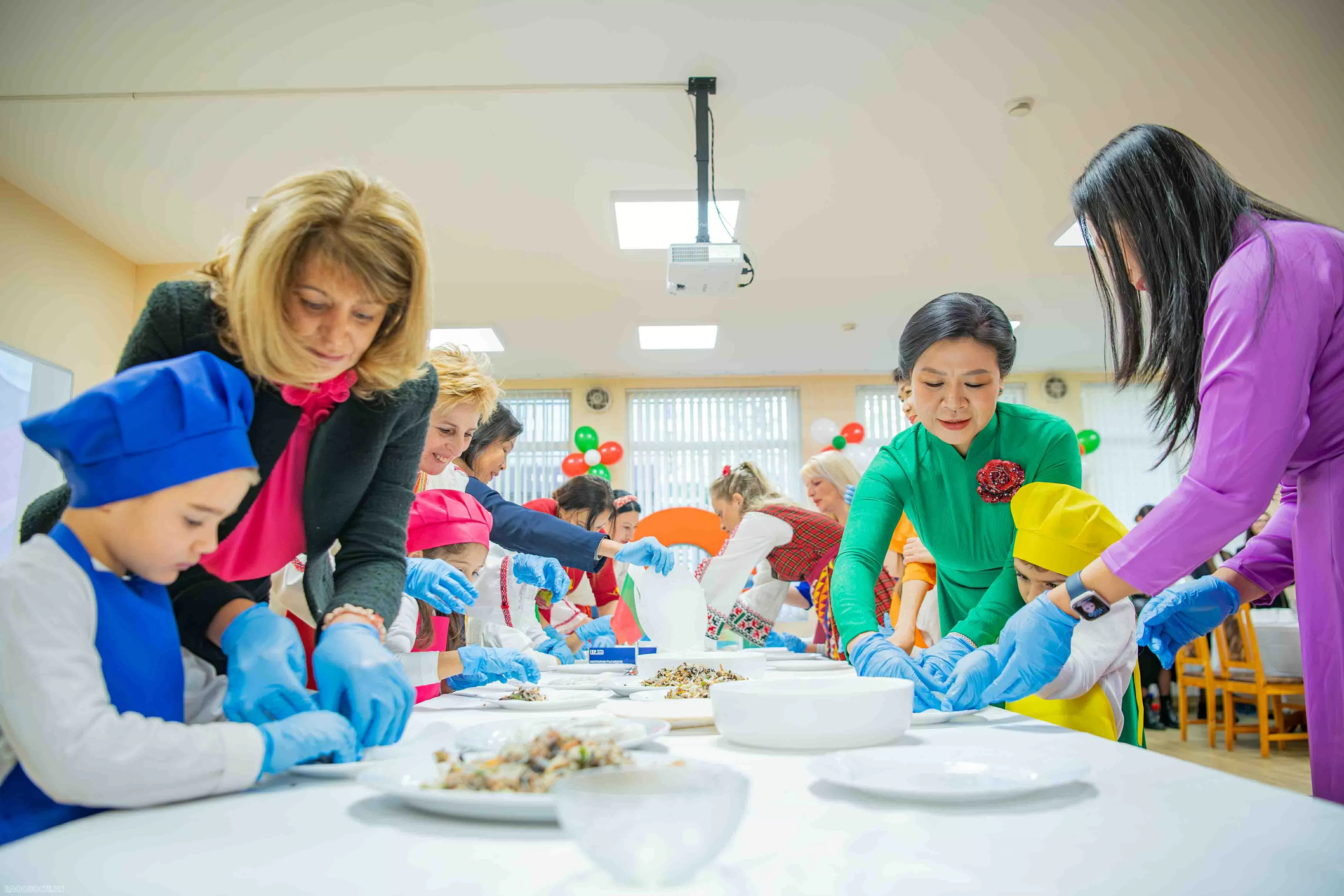 Không khí hữu nghị thêm ấm áp khi Phu nhân Desislava Radeva cùng các em nhỏ hào hứng học cuốn nem, món ăn biểu trưng của ẩm thực Việt Nam. Những chiếc nem nhỏ xinh được hai Phu nhân, thầy cô và các em cùng thưởng thức trong tiếng cười vui vẻ, trong khung cảnh thân tình, gần gũi.