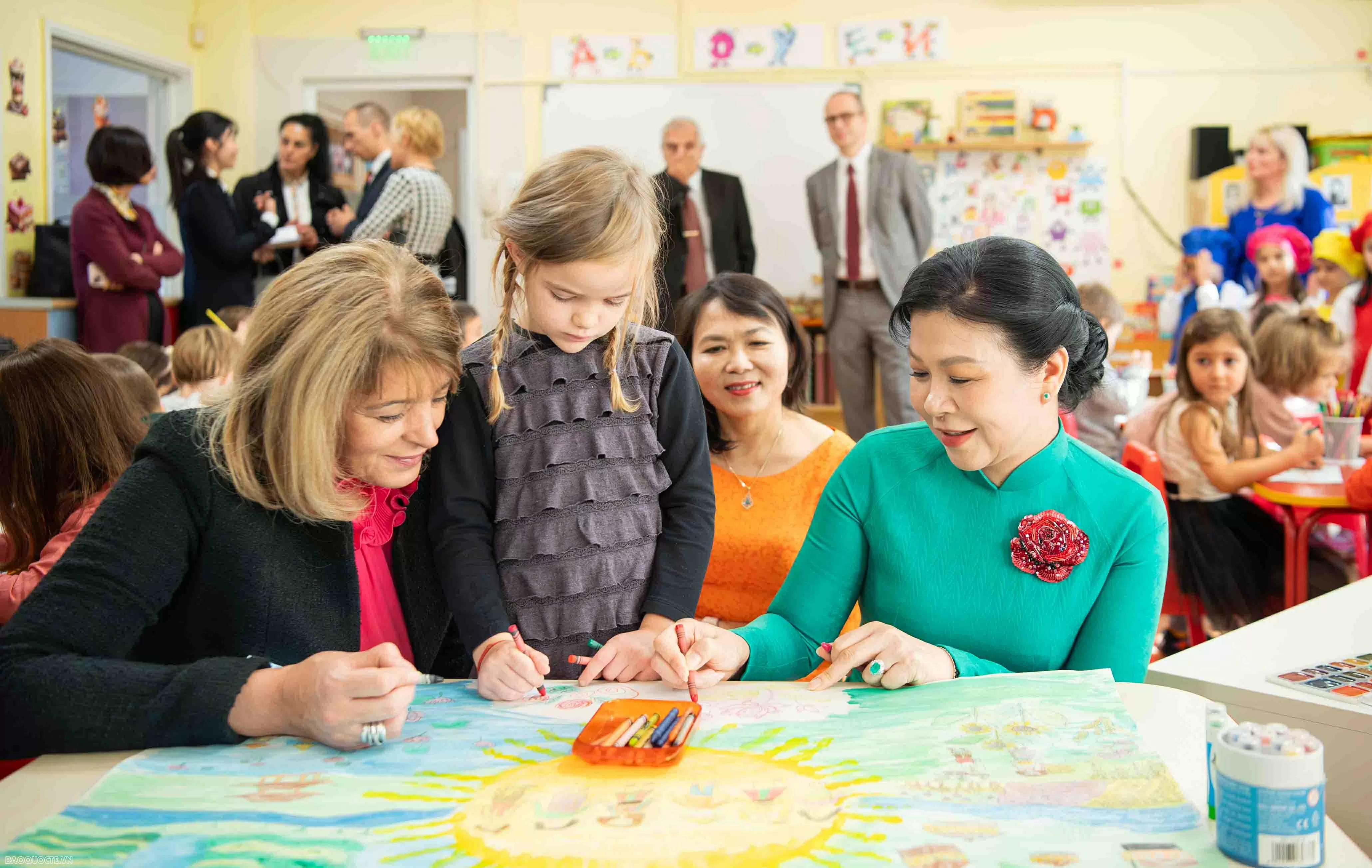 Phu nhân Ngô Phương Ly cho biết, Việt Nam luôn coi giáo dục mầm non là nền tảng quan trọng trong phát triển con người. Việt Nam không ngừng đầu tư cơ sở vật chất, nâng cao chất lượng đội ngũ giáo viên và đổi mới phương pháp giảng dạy theo hướng hiện đại, lấy trẻ làm trung tâm.