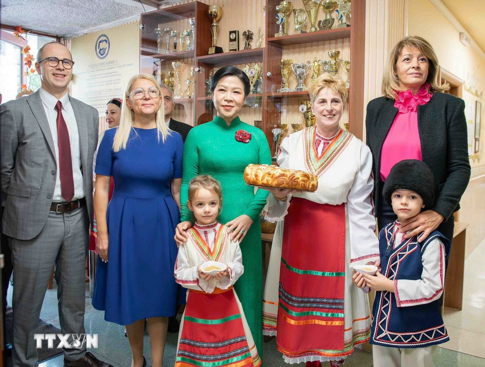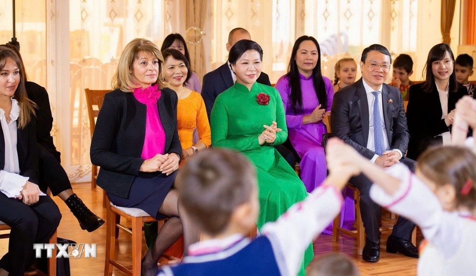 Hai Phu nhân cùng hoàn thiện bức tranh chung về tình hữu nghị Việt Nam-Bulgaria. (Ảnh: TTXVN)
