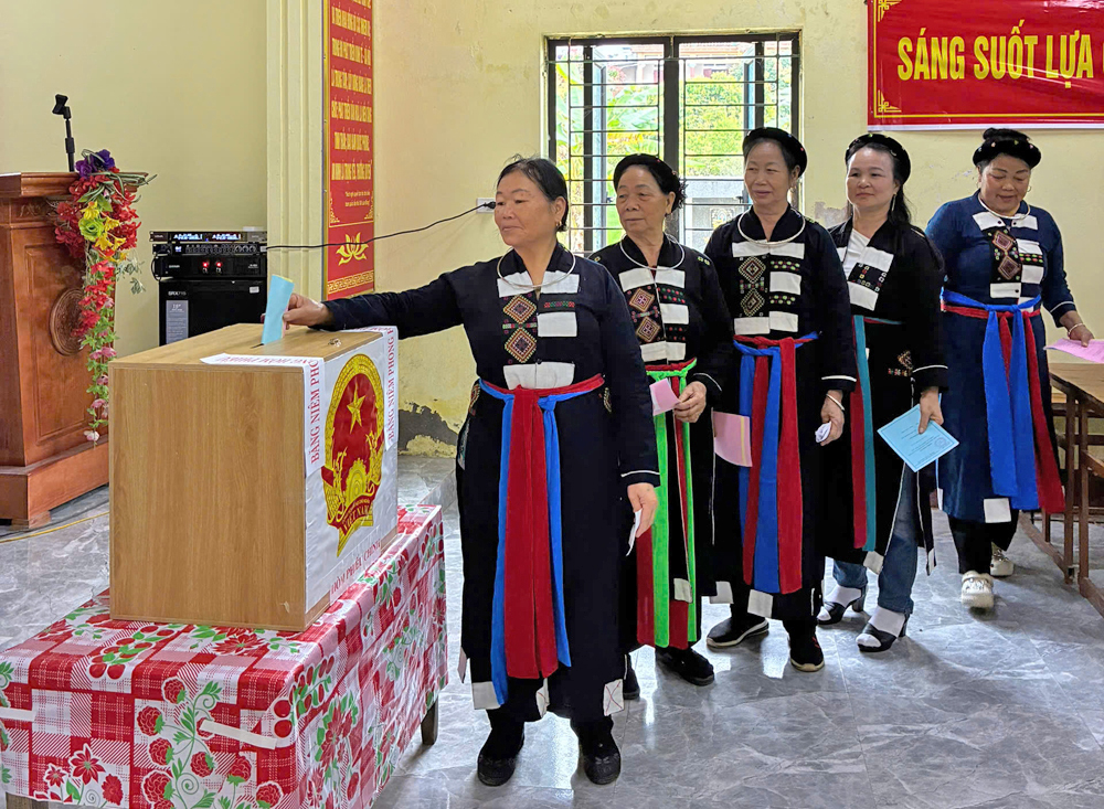 Phụ nữ xã Lục Sơn trong trang phục truyền thống thực hiện quyền và nghĩa vụ công dân.
