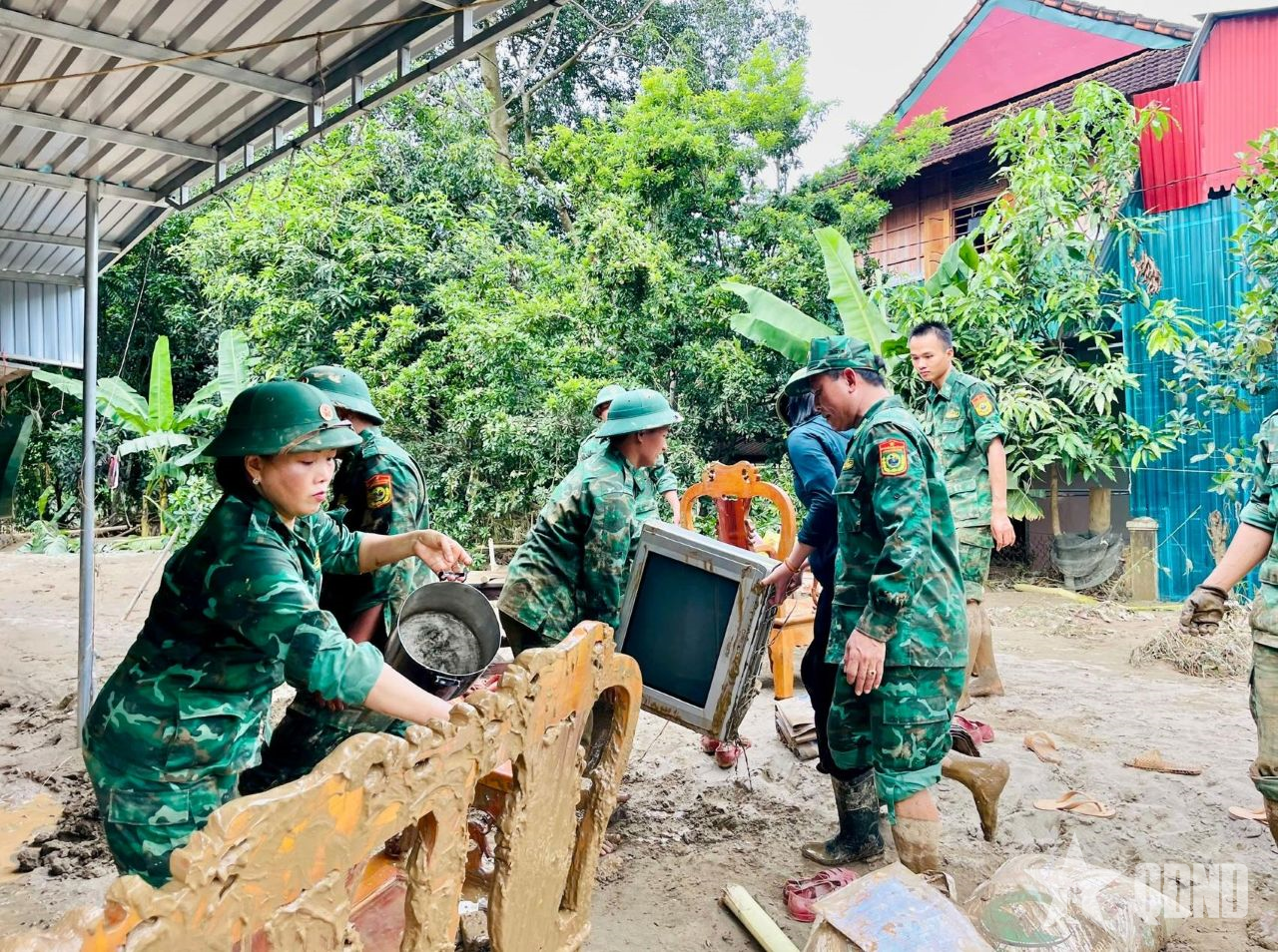 Hội viên phụ nữ Ban chỉ huy Bộ đội Biên phòng tỉnh Nghệ An tham gia hỗ trợ nhân dân địa phương khắc phục hậu quả mưa lũ.