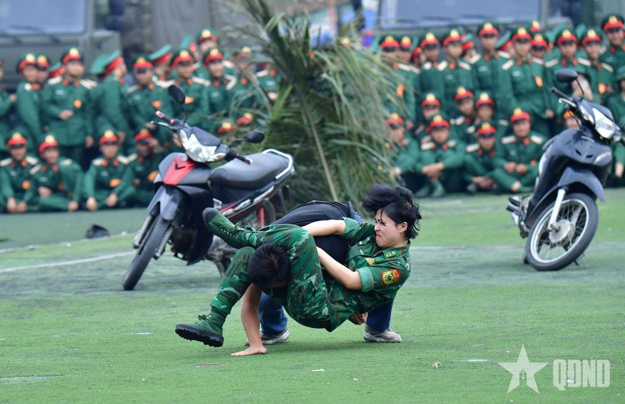 Hội viên phụ nữ Ban chỉ huy Bộ đội Biên phòng tỉnh Nghệ An tích cực luyện tập võ thuật nâng cao sức khỏe, đáp ứng yêu cầu SSCĐ và công tác.
