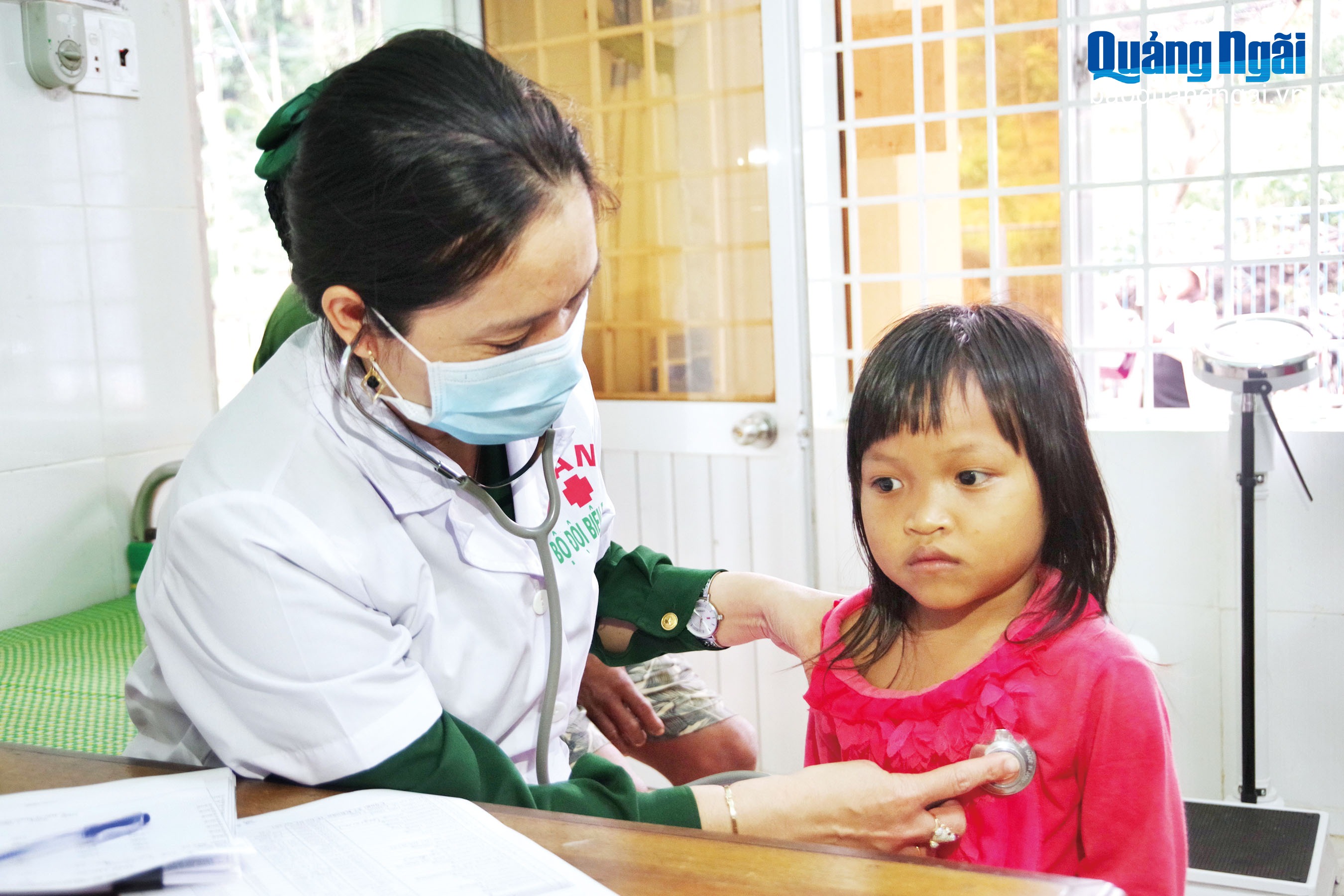 Nữ quân y biên phòng khám bệnh miễn phí cho trẻ em tại xã Ba Tô. Ảnh: X.THIÊN